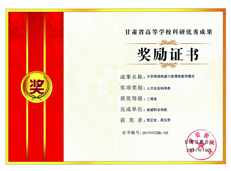近日從學(xué)院科研處傳來喜訊,我系教師賀正全申報(bào)的《大學(xué)英語快速口練課堂教學(xué)模式》榮獲甘肅省教育廳頒發(fā)的2017年甘肅省高等學(xué)校科研優(yōu)秀成果二等獎(jiǎng)。這是我院自建院以來獲得的最高級別的高??蒲袃?yōu)秀成果獎(jiǎng)。本次獲得二等獎(jiǎng)的科研成果共有154項(xiàng),其中高職高專報(bào)送的科研成果只有9項(xiàng)獲得二等獎(jiǎng)。