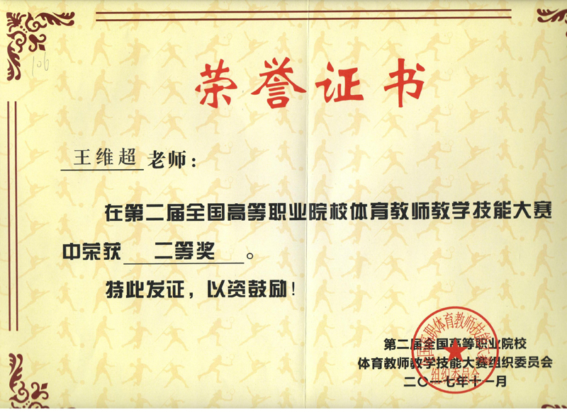 2017年11月27日至30日,人文藝術(shù)教育系王維超老師,代表我省參加了由教育部高等學(xué)校體育指導(dǎo)委員會(huì)在蘇州職業(yè)大學(xué)舉辦的,第二屆全國高等職業(yè)院校體育教師技能大賽,經(jīng)過激烈角逐最終榮獲二等獎(jiǎng)。