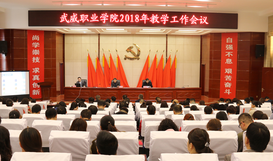 黨委副書記趙明對學(xué)院2017年教學(xué)工作做了簡要回顧與總結(jié),結(jié)合全國全省教育工作會議精神,深入分析了學(xué)院目前面臨的困難與存在的問題,從八個方面對2018年學(xué)院教學(xué)重點工作做了安排部署。一是加強思想政治建設(shè),貫徹落實中央決策部署。學(xué)習(xí)貫徹習(xí)近平新時代中國特色社會主義思想和黨的十九大精神,貫徹落實全國教育大會精神,細化落實職業(yè)教育具體工作措施。二是深化改革,增強辦學(xué)活力。堅持依法治校,繼續(xù)完善內(nèi)部治理體系,加強學(xué)術(shù)委員會、職稱評審委員會建設(shè),健全管理體系和運行機制,大力推進人才培養(yǎng)模式改革和招生考試制度改革。三是強化內(nèi)涵,全力推進優(yōu)質(zhì)高職院校建設(shè)。抓實推進優(yōu)質(zhì)高職院校6個模塊19個項目94項任務(wù)312條子任務(wù)的建設(shè)工作,加強內(nèi)部協(xié)調(diào),全力推進。加強專業(yè)內(nèi)涵建設(shè)和實踐教學(xué)內(nèi)涵建設(shè),建立一批優(yōu)質(zhì)特色專業(yè)和一批高水平生產(chǎn)性實訓(xùn)基地;積極開展創(chuàng)新創(chuàng)業(yè)教育實踐活動,加大社會培訓(xùn)力度,積極探索開展國際合作與交流;加強智慧校園和校園文化建設(shè)。四是優(yōu)化結(jié)構(gòu),全力打造一批高水平優(yōu)質(zhì)特色專業(yè)。利用直屬附屬醫(yī)院、校辦企業(yè)武威泰豐新能源有限責(zé)任、甘肅(武威)國際陸港和武威保稅物流中心等優(yōu)勢,加快重點專業(yè)建設(shè)力度,打造3~5個國家級高水平優(yōu)質(zhì)特色專業(yè)。五是合作培養(yǎng),著力打造專兼結(jié)合的高水平教師隊伍。大力實施教師素質(zhì)提升工程,完善同濟大學(xué)編制的《武威職業(yè)學(xué)院師資能力提升培訓(xùn)方案》,落實西安交通大學(xué)、天津職業(yè)大學(xué)簽訂的合作協(xié)議,推進教師教學(xué)發(fā)展中心建設(shè)與運行,強化專業(yè)帶頭人、新進教師、骨干教師、優(yōu)秀青年教師的培養(yǎng)力度。六是育人為本,關(guān)注學(xué)生成長成才。優(yōu)化育人環(huán)境,開足開好思想政治類、人文素養(yǎng)提升類課程,開展校內(nèi)職業(yè)技能競賽,鼓勵支持參加省級以上比賽,培養(yǎng)學(xué)生能力。七是深化產(chǎn)教融合,提升社會服務(wù)水平。充分發(fā)揮職業(yè)教育集團作用,深化“職業(yè)教育+產(chǎn)業(yè)園區(qū)+生產(chǎn)基地”的校企合作模式;提升校辦企業(yè)、直屬附屬醫(yī)院的教學(xué)服務(wù)功能;各專業(yè)要拓展產(chǎn)教融合渠道,精準施策,服務(wù)國家戰(zhàn)略。八是完善質(zhì)量保障機制,提升人才培養(yǎng)質(zhì)量。編制并逐步推行教學(xué)工作診斷與改進方案,學(xué)習(xí)實施精細化管理模式,加大教學(xué)督查力度,規(guī)范教學(xué)秩序,提高教育教學(xué)管理水平。