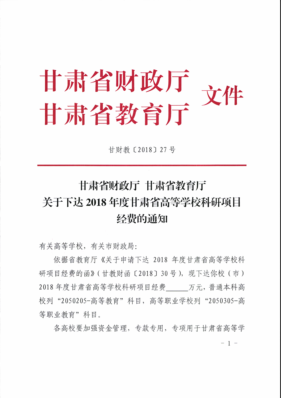 轉(zhuǎn)發(fā)甘肅省財(cái)政廳 甘肅省教育廳關(guān)于下達(dá)2018年度甘肅省高等學(xué)??蒲许?xiàng)目經(jīng)費(fèi)的通知