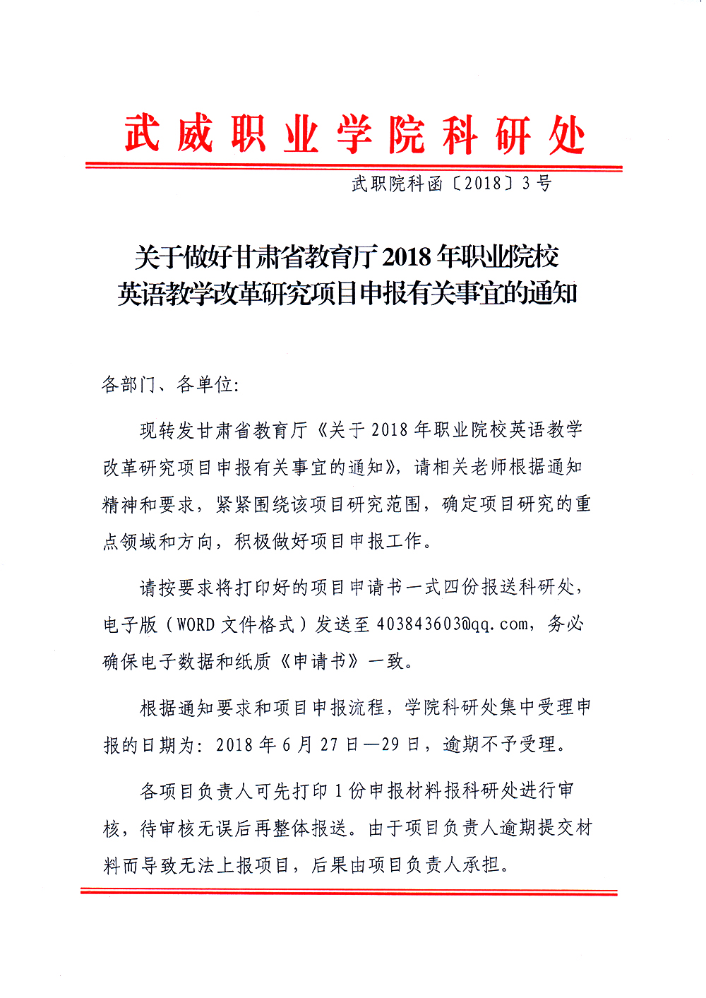 武職院科函〔2018〕3號(hào)——關(guān)于做好甘肅省教育廳2018年職業(yè)院校英語教學(xué)改革研究項(xiàng)目申報(bào)有關(guān)事宜的通知