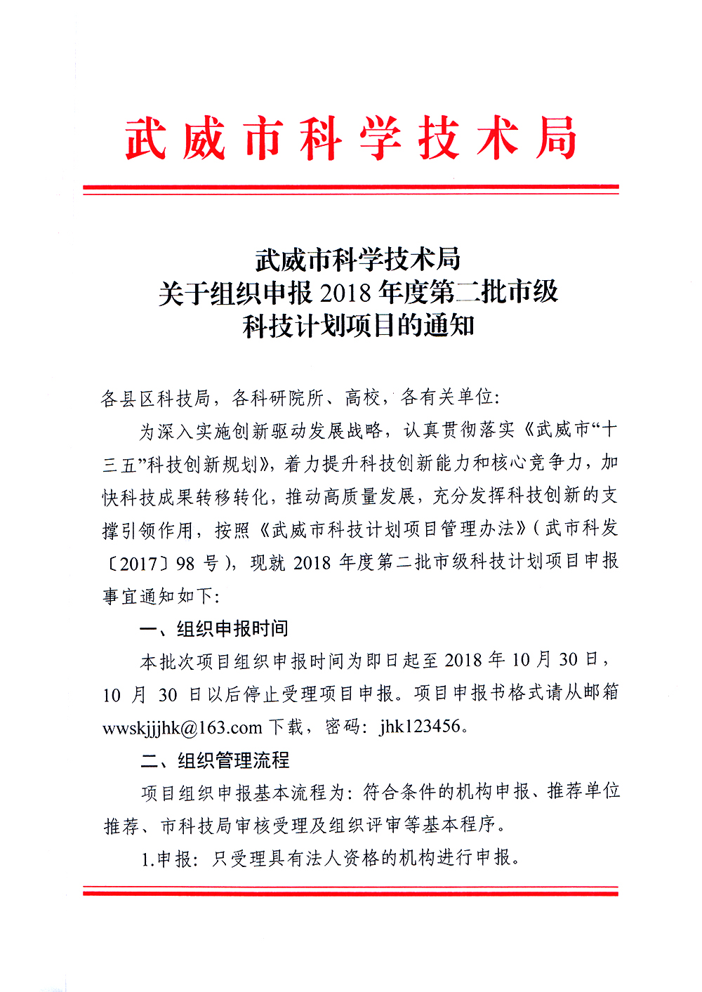 轉發(fā)武威市科學技術局關于組織申報2018年度第二批科技計劃項目的通知