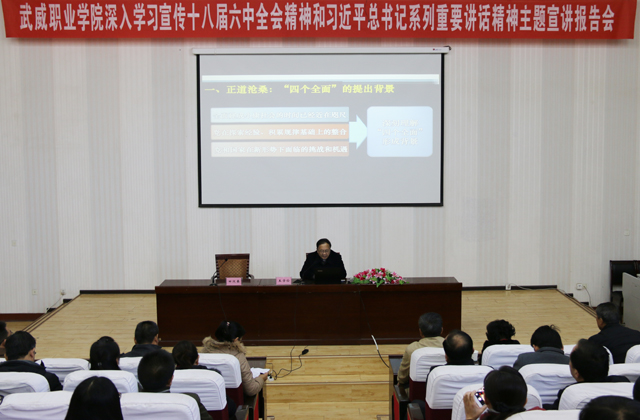 根據(jù)省委和全省宣傳工作會議關(guān)于在全省組織開展深入學(xué)習(xí)宣傳十八屆五中全會精神和習(xí)近平總書記系列重要講話精神主題宣講活動的通知要求,為向全院黨員干部和師生宣傳好、解讀好十八屆五中、六中全會精神和習(xí)近平總書記系列重要講話的實質(zhì)內(nèi)涵和深遠意義,將全會精神和總書記系列重要講話精神作為指導(dǎo)和推動學(xué)院各項事業(yè)快速發(fā)展的科學(xué)理論和強大動力。10月29日上午,“武威職業(yè)學(xué)院深入學(xué)習(xí)宣傳十八屆五中、六中全會精神和習(xí)近平總書記系列重要講話精神主題宣講報告會”在學(xué)院尚德樓正德廳舉行。會議邀請省委講師團成員、蘭州大學(xué)馬克思主義學(xué)院博士生導(dǎo)師王學(xué)儉教授蒞臨學(xué)院,作題為“四個全面”戰(zhàn)略布局解讀的宣講報告。學(xué)院黨委副書記趙明,副院長王永緒、潘玉華、田迎春,全體中層干部,各部門師生代表共計260余人參加宣講報告會。報告會由田迎春主持。