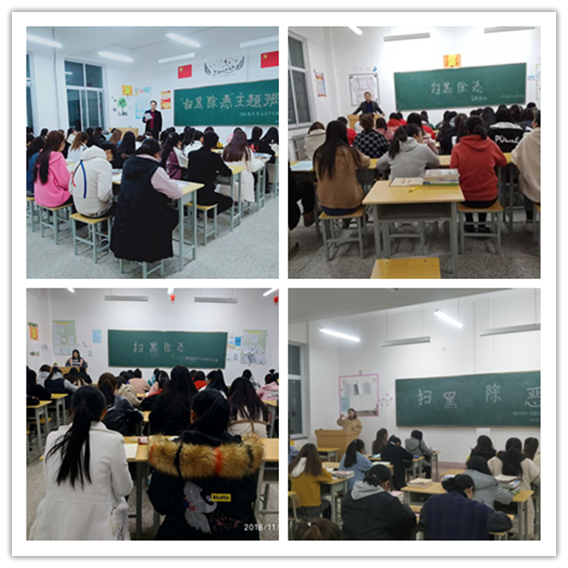 各班班主任精心準備,帶領學生學習“掃黑除惡”宣傳材料。重點針對“校園貸”、“老鄉(xiāng)會”、“黃賭毒”、校園欺凌和網絡威脅等違法犯罪行為進行深刻剖析,并提出了行之有效的防范措施,確保師生人身和財產安全。