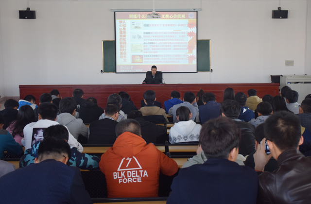 翟存祥從社會主義核心價值觀的時代背景、社會主義核心價值觀的頂層設計、核心價值觀與核心價值體系的關系、社會主義核心價值觀的系統(tǒng)培育、社會主義核心價值觀的全面踐行等五個方面,分析了中國共產(chǎn)黨價值取向的發(fā)展歷程、培育和踐行社會主義核心價值觀的重要性和迫切性,培育和踐行社會主義核心價值觀對實現(xiàn)中國夢的重要現(xiàn)實意義和深遠歷史意義,以及培育和踐行社會主義核心價值觀的措施等問題,并對為什么要培育和踐行、怎么培育和踐行作了系統(tǒng)和精彩的解讀。翟存祥指出,十八大報告將社會主義核心價值觀凝練為24個字:“富強、民主、文明、和諧;自由、平等、公正、法治;愛國、敬業(yè)、誠信、友善”,從國家、社會、個人三個層面,簡單扼要、簡約樸實、簡潔通俗地提出了社會主義核心價值觀的新表達,也為當今中國社會的核心價值觀構建提出了新要求。社會主義核心價值觀既有理論的延續(xù)性,又有現(xiàn)實的針對性;既有目標追求,又有價值導向,還有行為準則,是人心所愿、眾望所歸。翟存祥結合學院發(fā)展實際,要求學生黨員及班團干部從現(xiàn)在做起,從自己做起,努力向上,踐行社會主義核心價值觀,追求有信念,有夢想,有奮斗,有奉獻的人生,讓自己的人生更有意義。