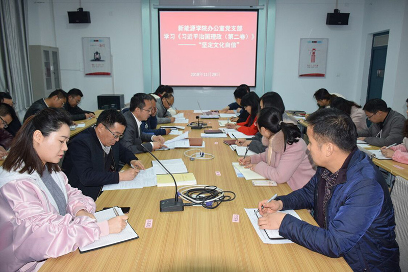 為貫徹落實(shí)黨的十九大精神和《習(xí)近平談治國(guó)理政(第二卷)》中關(guān)于堅(jiān)定文化自信的相關(guān)精神,11月29日,新能源學(xué)院辦公室黨支部組織開展集中學(xué)習(xí)和交流會(huì),支部書記任陶主持會(huì)議,全體黨員參加了會(huì)議。