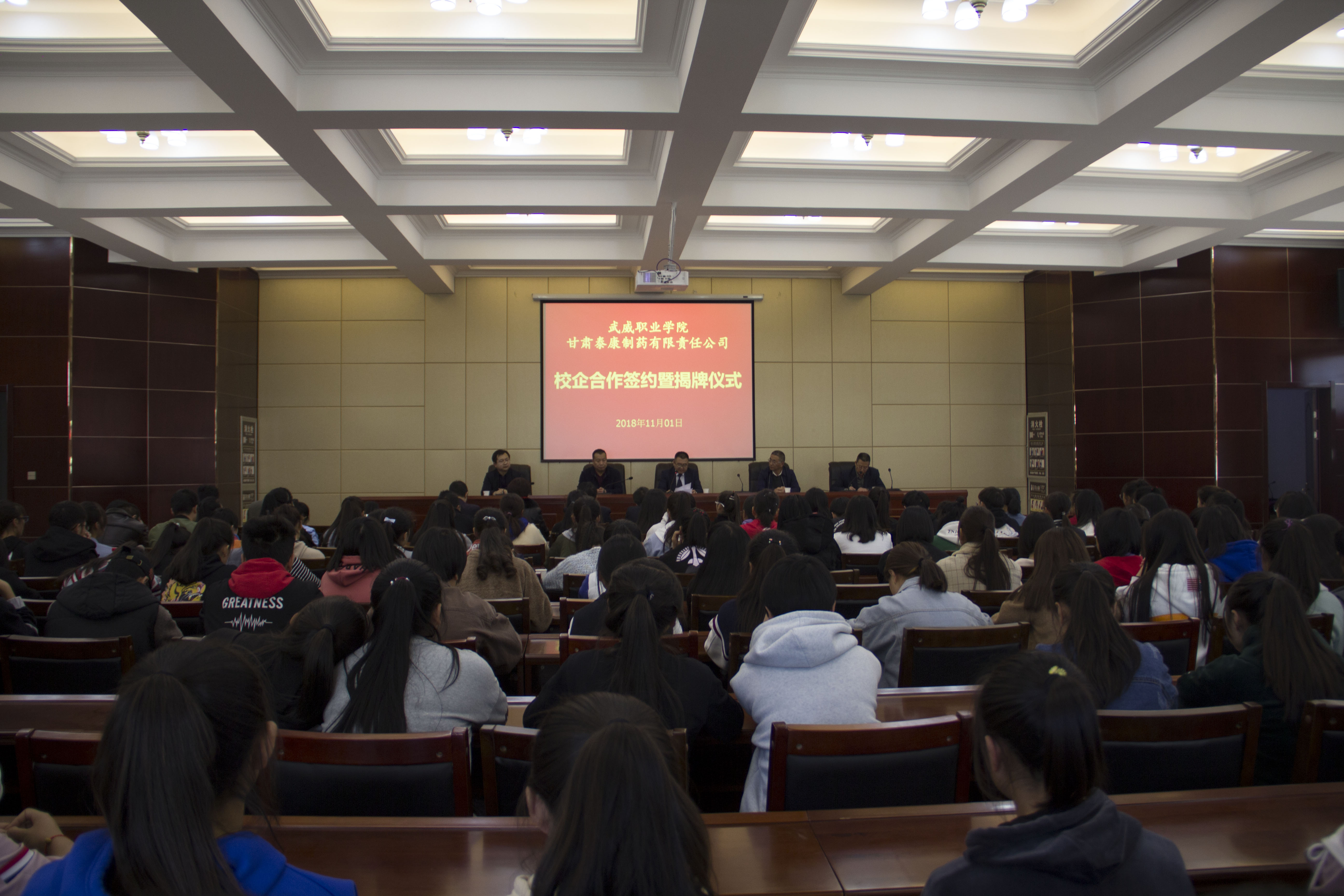 為提高人才培養(yǎng)質(zhì)量和辦學水平,加強校企協(xié)同育人機制建設(shè),11月1日下午,藥學系與甘肅泰康制藥有限責任公司校企合作共建“就業(yè)實習基地”簽約揭牌儀式在行樹樓北側(cè)會議室隆重舉行。甘肅泰康制藥有限責任公司投資方—北京久朝集團產(chǎn)業(yè)中心總監(jiān)楊宏超、公司總工程師毛著鴻、財務(wù)總監(jiān)郝敏等企業(yè)領(lǐng)導出席本次儀式。學院教務(wù)處處長仲生仁、招生就業(yè)處處長蔡柱山、藥學系主任魏潤明、副主任楊建美、黨總支副書記單光年及藥學系160余名師生參加了此次簽約揭牌儀式。儀式由魏潤明主持。