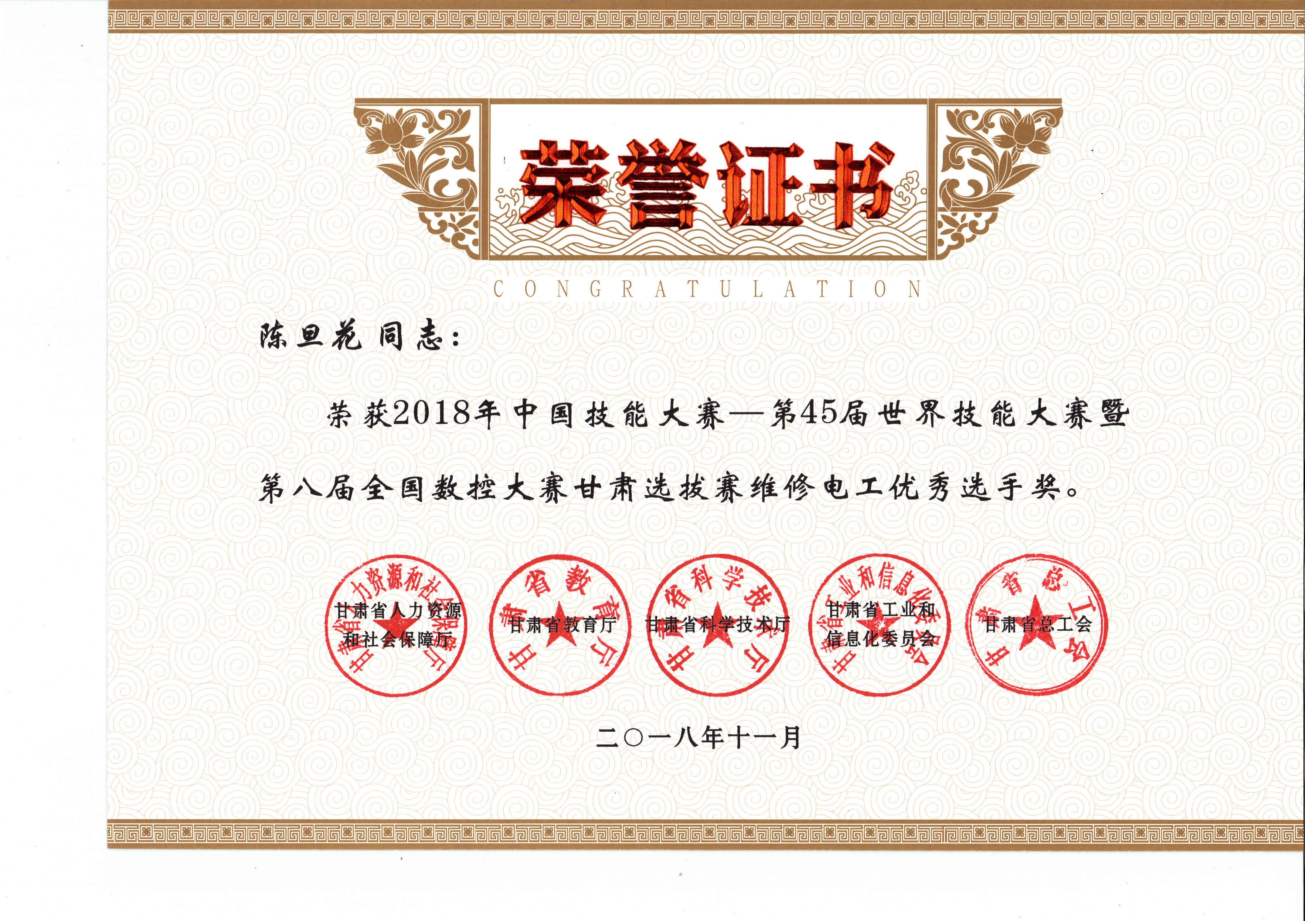 2018年中國技能大賽--第45屆世界技能大賽暨第八屆全國數(shù)控大賽甘肅選拔賽(維修電工項目)獲獎證書