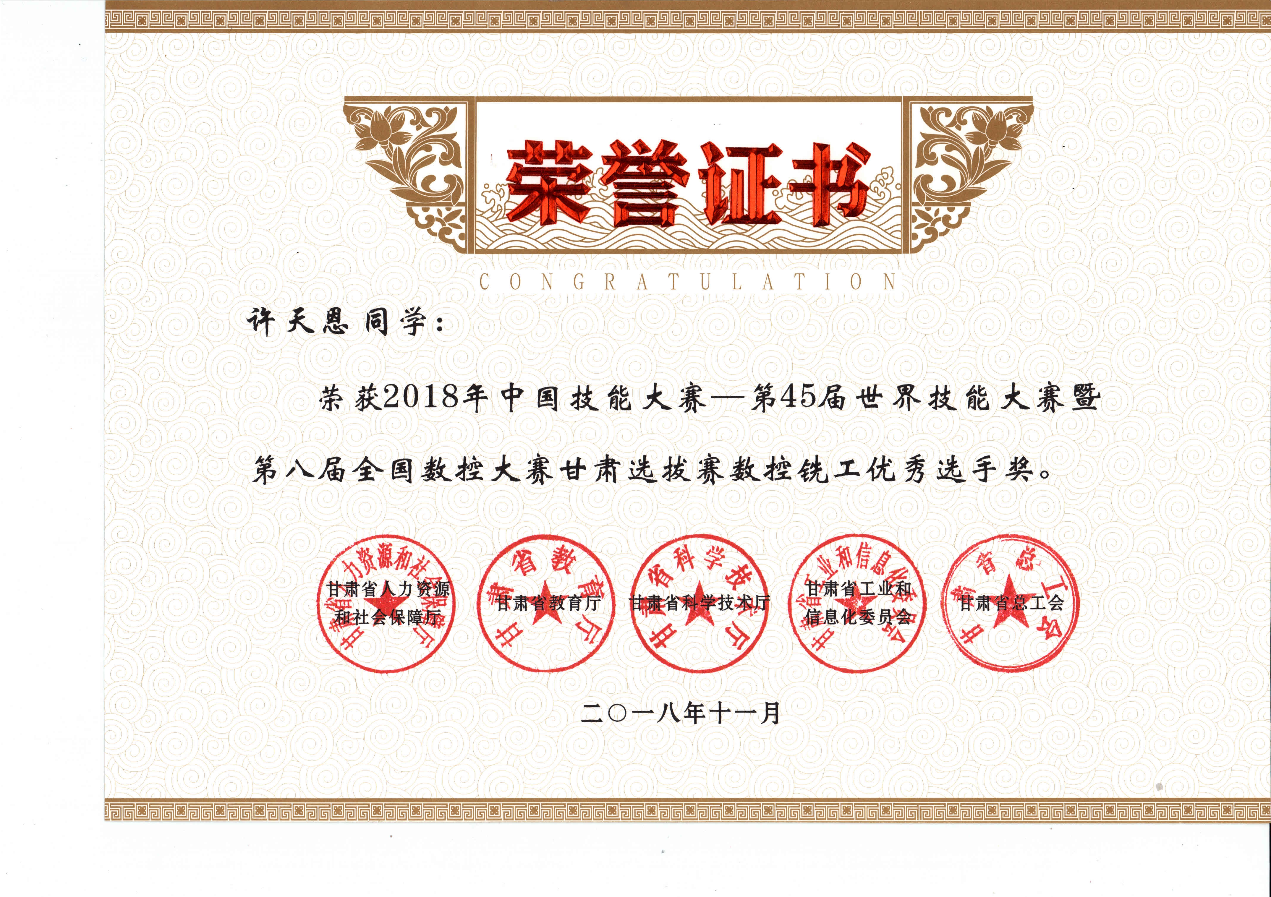 2018年中國技能大賽--第45屆世界技能大賽暨第八屆全國數(shù)控大賽甘肅選拔賽(數(shù)控銑工項(xiàng)目)獲獎證書