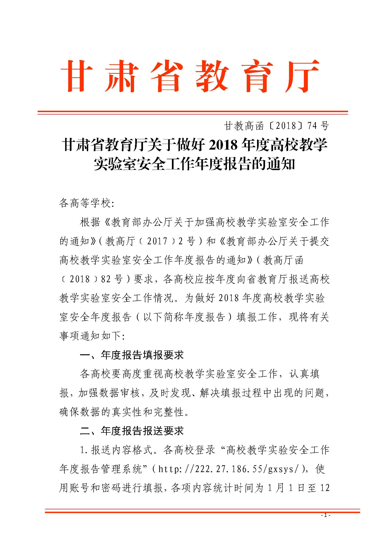 甘肅省教育廳關(guān)于做好2018年度高校教學(xué)實(shí)驗(yàn)室安全工作年度報(bào)告的通知