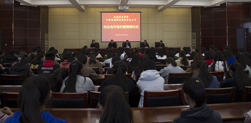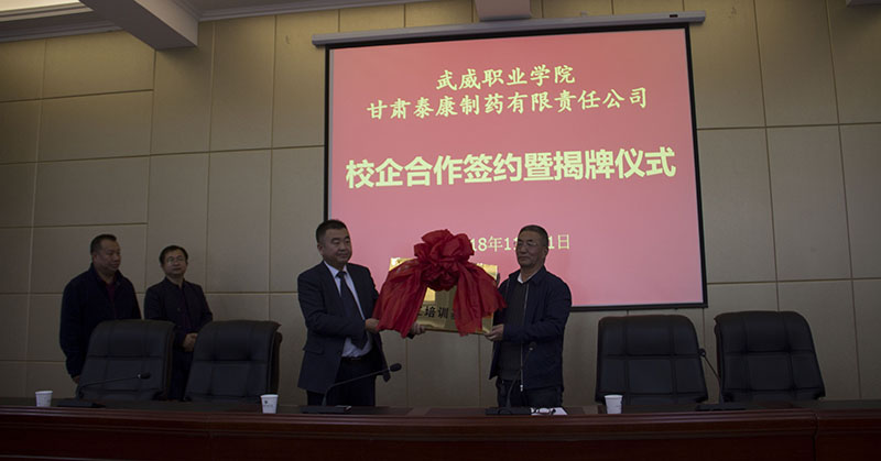 為提高人才培養(yǎng)質(zhì)量和辦學(xué)水平,加強(qiáng)校企協(xié)同育人機(jī)制建設(shè),11月1日下午,藥學(xué)系與甘肅泰康制藥有限責(zé)任公司校企合作共建“就業(yè)實(shí)習(xí)基地”簽約揭牌儀式在行樹樓北側(cè)會議室隆重舉行。甘肅泰康制藥有限責(zé)任公司投資方—北京久朝集團(tuán)產(chǎn)業(yè)中心總監(jiān)楊宏超、公司總工程師毛著鴻、財(cái)務(wù)總監(jiān)郝敏等企業(yè)領(lǐng)導(dǎo)出席本次儀式。學(xué)院教務(wù)處處長仲生仁、招生就業(yè)處處長蔡柱山、藥學(xué)系主任魏潤明、副主任楊建美、黨總支副書記單光年及藥學(xué)系160余名師生參加了此次簽約揭牌儀式。儀式由魏潤明主持。
