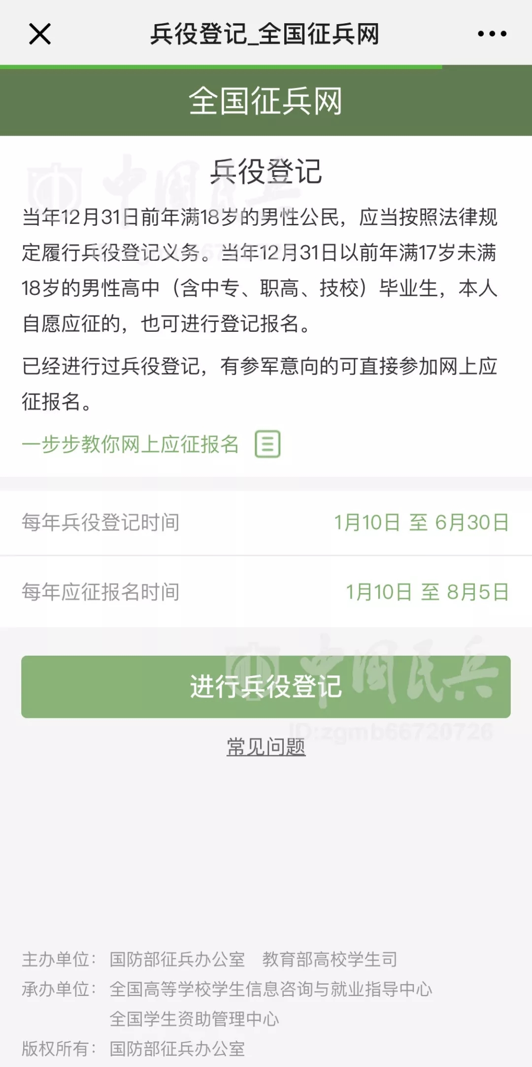 中國民兵北京1月9日電?張東華、記者劉國順報道:日前,國防部征兵辦公室下發(fā)《關(guān)于做好2019年征兵準(zhǔn)備工作的通知》,對新年度征兵準(zhǔn)備工作進(jìn)行安排部署,要求各地深入貫徹習(xí)近平強軍思想,全面聚焦備戰(zhàn)打仗,統(tǒng)籌推進(jìn)征兵組織建設(shè)、能力建設(shè)、法規(guī)建設(shè)、廉政建設(shè),確保高質(zhì)量完成新年度征兵任務(wù),并明確全國征兵網(wǎng)(網(wǎng)址:http://www.gfbzb.gov.cn),或關(guān)注“中國民兵”微信公眾號(ID:zgmb66720726)1月10日正式開通,受理網(wǎng)上兵役登記、應(yīng)征報名和政策咨詢等工作事項。