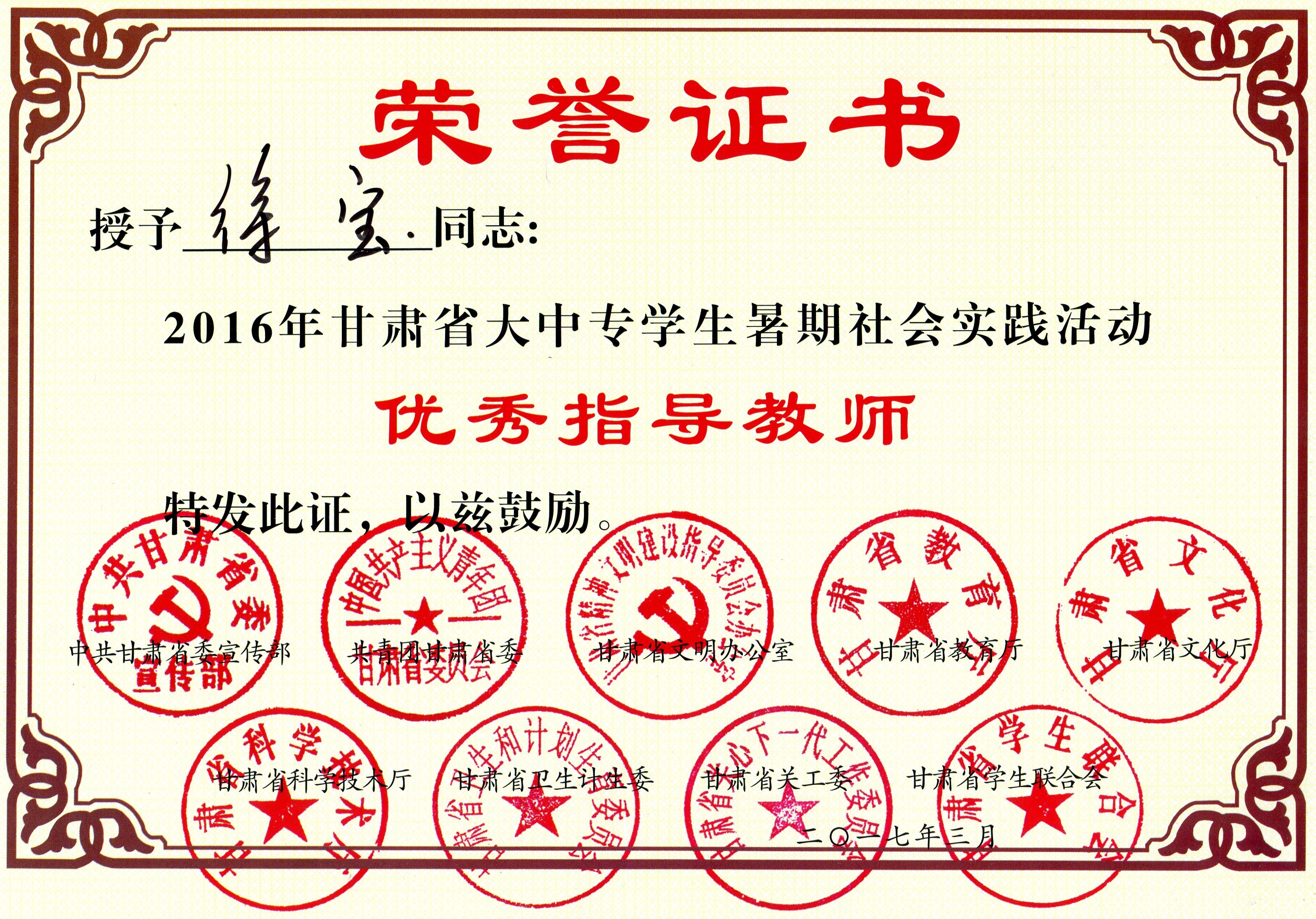 2017年甘肅省大中專學(xué)生暑期社會實踐活動“優(yōu)秀指導(dǎo)教師”