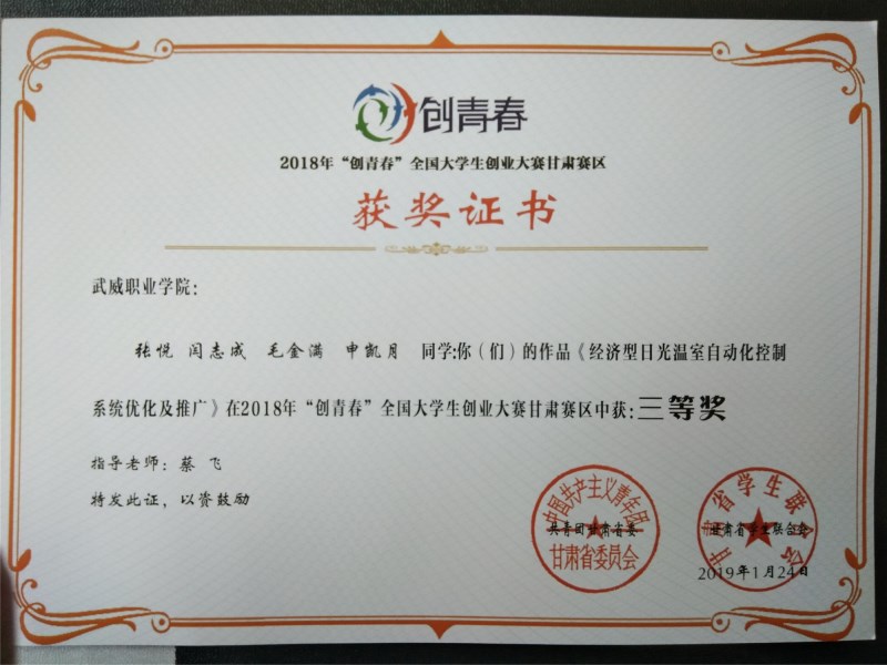 現(xiàn)代農(nóng)業(yè)技術(shù)系兩件作品獲得2018年“創(chuàng)青春”全國大學(xué)生創(chuàng)業(yè)大賽甘肅賽區(qū)三等獎(jiǎng)