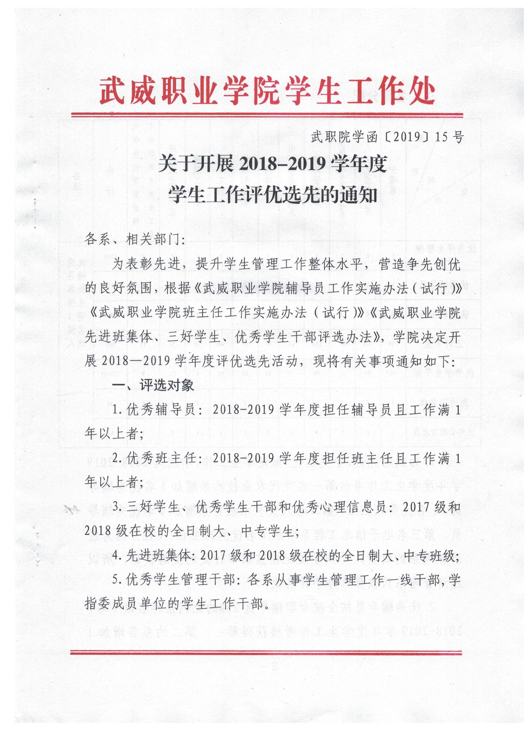關(guān)于開(kāi)展2018-2019學(xué)年度學(xué)生工作評(píng)優(yōu)選先的通知