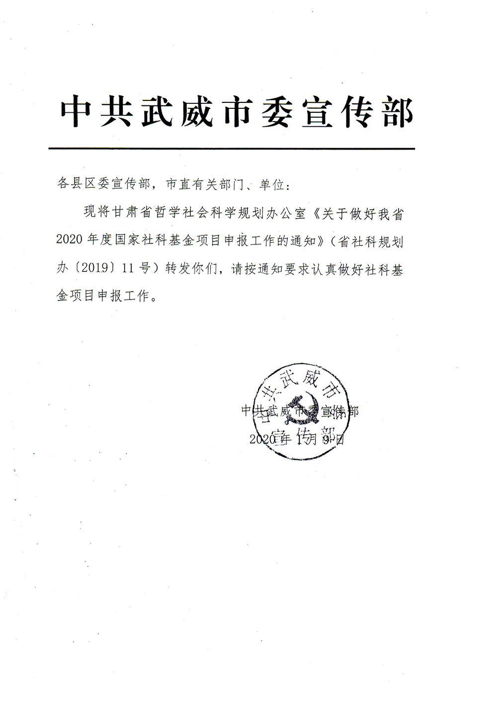轉發(fā)中共武威市委宣傳部《關于做好甘肅省2020年度國家社科基金項目申報工作的通知》