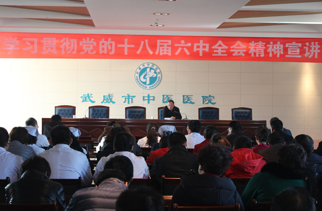 在全市上下深入學(xué)習(xí)宣傳貫徹黨的十八屆六中全會精神之際,12月15日下午,直屬附屬醫(yī)院邀請武威市委講師團(tuán)張生龍同志為全院黨員和中層干部作黨的十八屆六中全會精神宣講報告。
