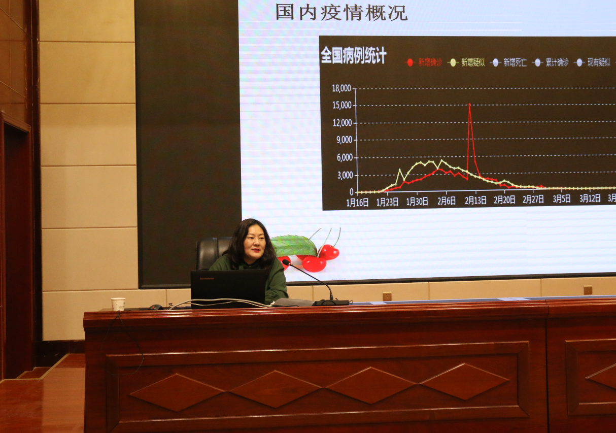 馬艷主任以《新冠肺炎疫情防控》為題,從國內(nèi)外疫情分析、對(duì)新冠肺炎的認(rèn)識(shí)、大專院校新冠肺炎疫情防控要求措施以及開學(xué)后應(yīng)該注意哪些問題等幾個(gè)方面做了深入講解。