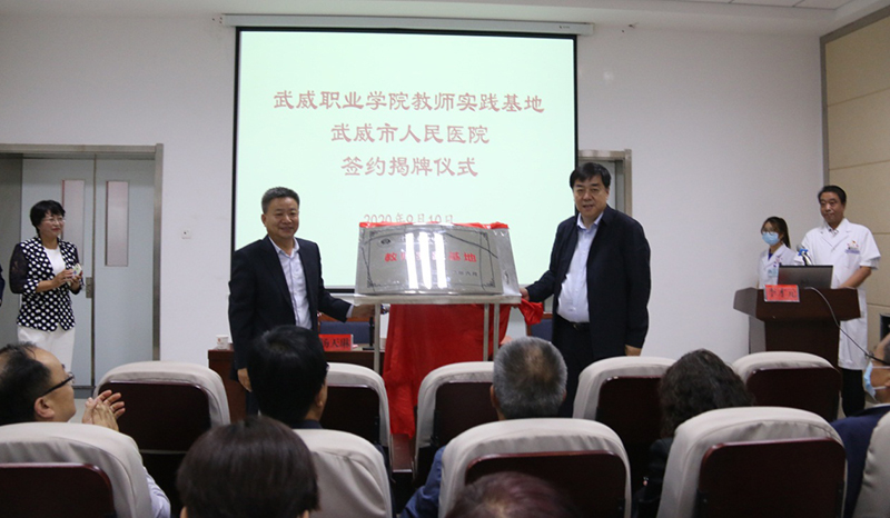 2020年9月10日上午,武威職業(yè)學(xué)院與武威市人民醫(yī)院在武威市人民醫(yī)院舉行教師實踐基地簽約暨揭牌儀式。學(xué)院黨委書記、院長趙明、副院長王永緒,武威市人民醫(yī)院黨委書記楊天琳、副書記、院長王世中出席。學(xué)院部分職能科室負(fù)責(zé)人、醫(yī)學(xué)類專業(yè)教師代表及武威市人民醫(yī)院行政科室代表參加了儀式。武威市人民醫(yī)院黨委委員、副院長李才元主持儀式。