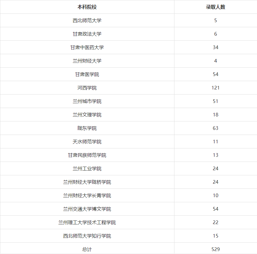 2020年甘肅省普通高等學(xué)校專升本第一批、第二批考試招生工作已圓滿結(jié)束。我院2020屆畢業(yè)生捷報(bào)頻傳,創(chuàng)下了歷年“專升本”升學(xué)的最好成績。726名學(xué)生報(bào)名參加考試,有529名學(xué)生被省內(nèi)本科院校錄取,錄取率為72.87%。