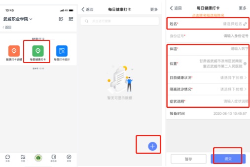 2.每日健康打卡:點擊每日健康打開——點擊右下角?號——點擊姓名框選擇姓名——填寫內(nèi)容——提交。