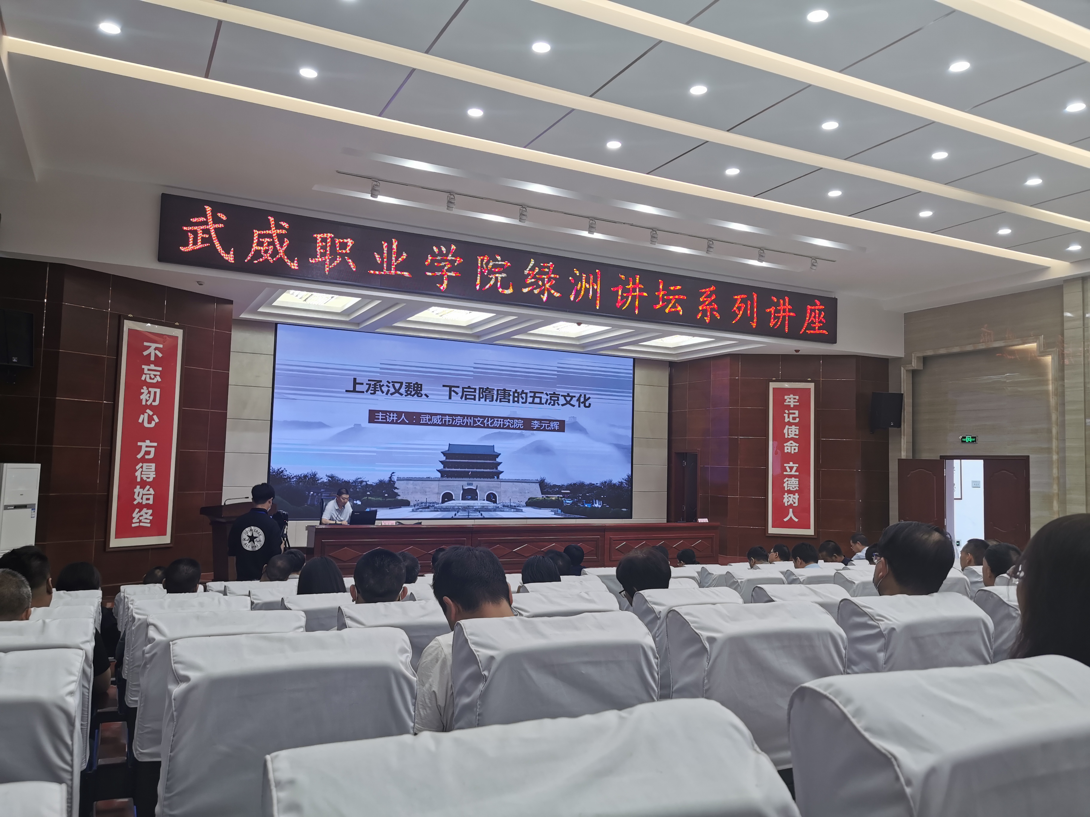 6月12日上午,學(xué)院第34期“綠洲講壇”在菁英廳舉辦,邀請武威市涼州文化研究院研究員、涼州文化研究資深專家李元輝作題為《上承漢魏,下啟隋唐的五涼文化》的專題報(bào)告。蒞臨報(bào)告會的有涼州文化研究院副院長王守榮同志,涼州文化研究院文史工作者柴多茂、趙大泰、楊琴琴等同志。學(xué)院領(lǐng)導(dǎo)、中層干部和師生代表共150人聆聽了報(bào)告。報(bào)告會由學(xué)院黨委副書記翟存祥主持。