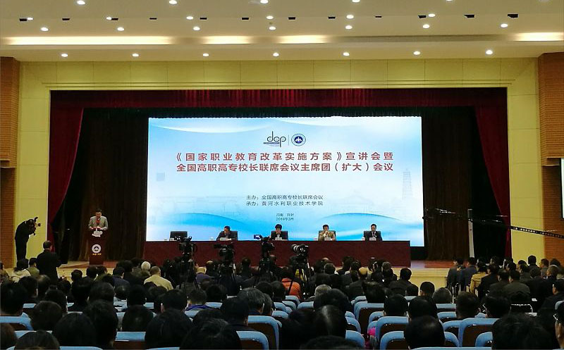 近日,《國家職業(yè)教育改革實施方案》宣講會暨全國高職高專校長聯(lián)席會議主席團(擴大)會議在黃河水利職業(yè)技術(shù)學(xué)院召開。教育部職業(yè)教育與成人教育司副司長謝俐出席會議。學(xué)院黨委書記、院長趙明與全國高職高專校長聯(lián)席會議主席團成員、全國高職高專院校負責(zé)人代表等700余人參加會議。會議由全國高職高專校長聯(lián)席會議主席、中國職業(yè)技術(shù)教育學(xué)會副會長、天津職業(yè)大學(xué)原校長董剛主持。
