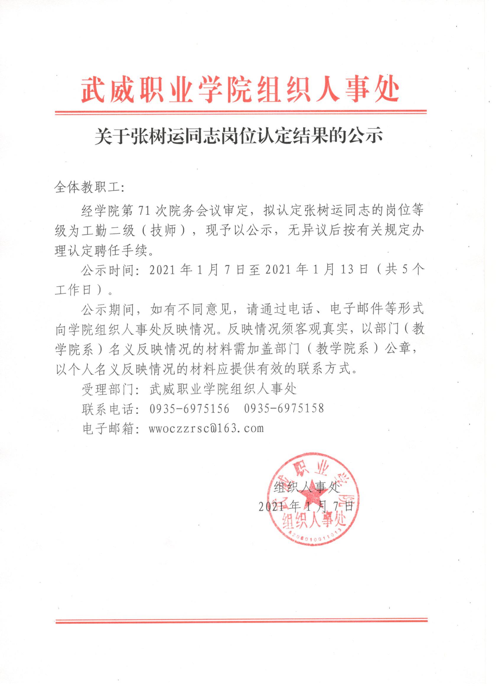 關于張樹運同志崗位認定結果的公示