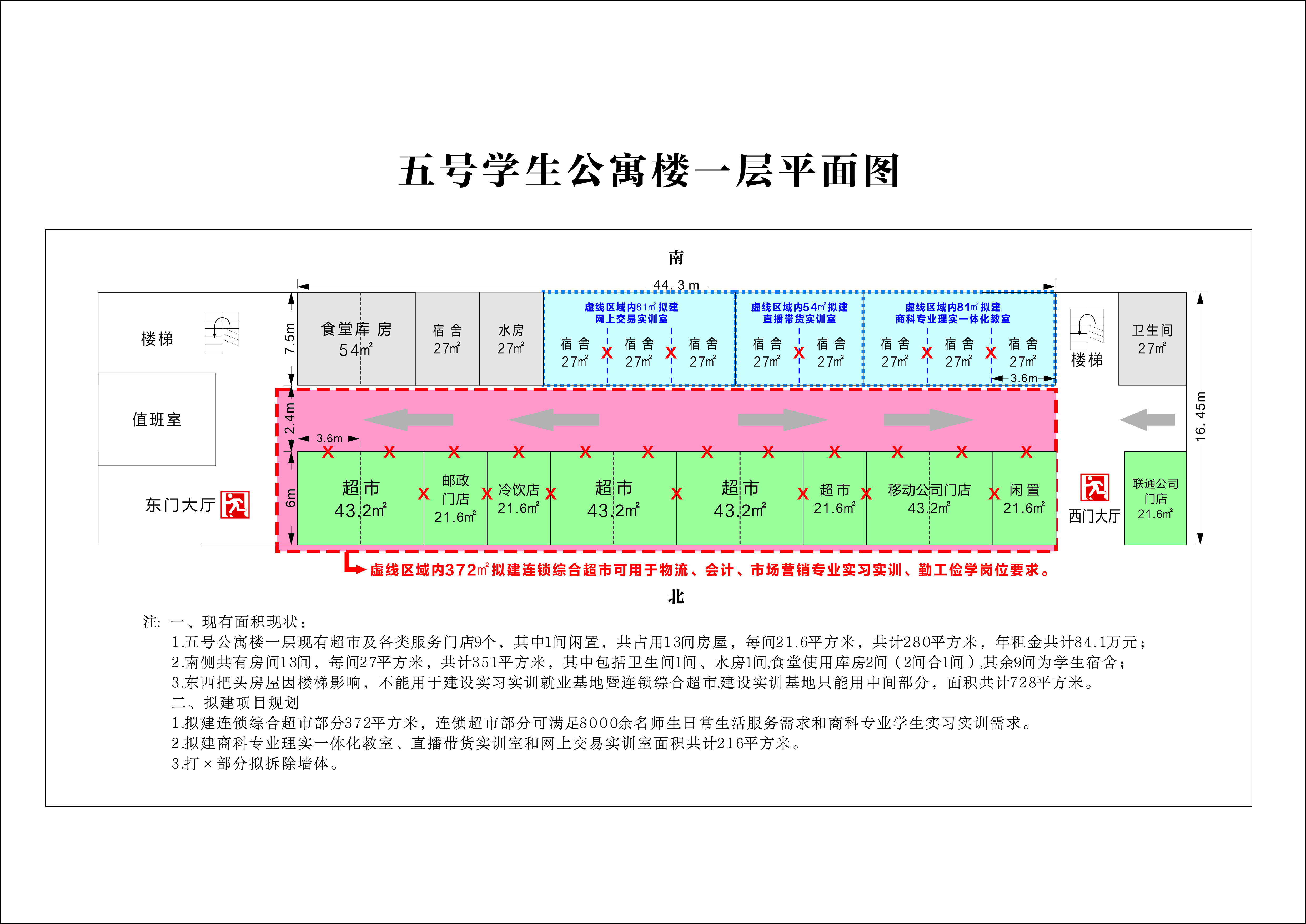 4.學(xué)院提供五號(hào)學(xué)生公寓樓一層面積共計(jì)728平方米場(chǎng)地用于建設(shè)學(xué)院商科專(zhuān)業(yè)所需產(chǎn)教融合實(shí)習(xí)實(shí)訓(xùn)就業(yè)基地暨連鎖綜合超市,其中,216平方米用于建設(shè)商科專(zhuān)業(yè)理實(shí)一體化教室、直播帶貨實(shí)訓(xùn)室和網(wǎng)上交易實(shí)訓(xùn)室;372平方米(原商鋪面積為259平方米,增加113平方米為樓道走廊)用于建設(shè)連鎖綜合超市及實(shí)訓(xùn)場(chǎng)所,滿足師生日常生活需求和商科專(zhuān)業(yè)學(xué)生頂崗實(shí)習(xí)、實(shí)訓(xùn)、勤工儉學(xué)等(改建方案詳見(jiàn)附后平面圖)。建設(shè)所需手續(xù)由學(xué)院和企業(yè)雙方配合完成辦理。