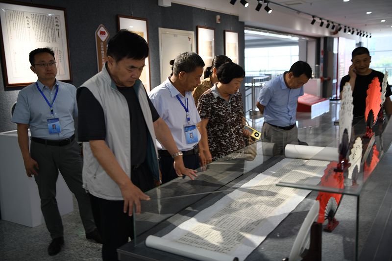 會后,考察組一行在學院領導的陪同下先后參觀考察了學院紅色文化藝術(shù)館、中華優(yōu)秀傳統(tǒng)文化藝術(shù)作品展,趙明向考察組做了詳細講解。