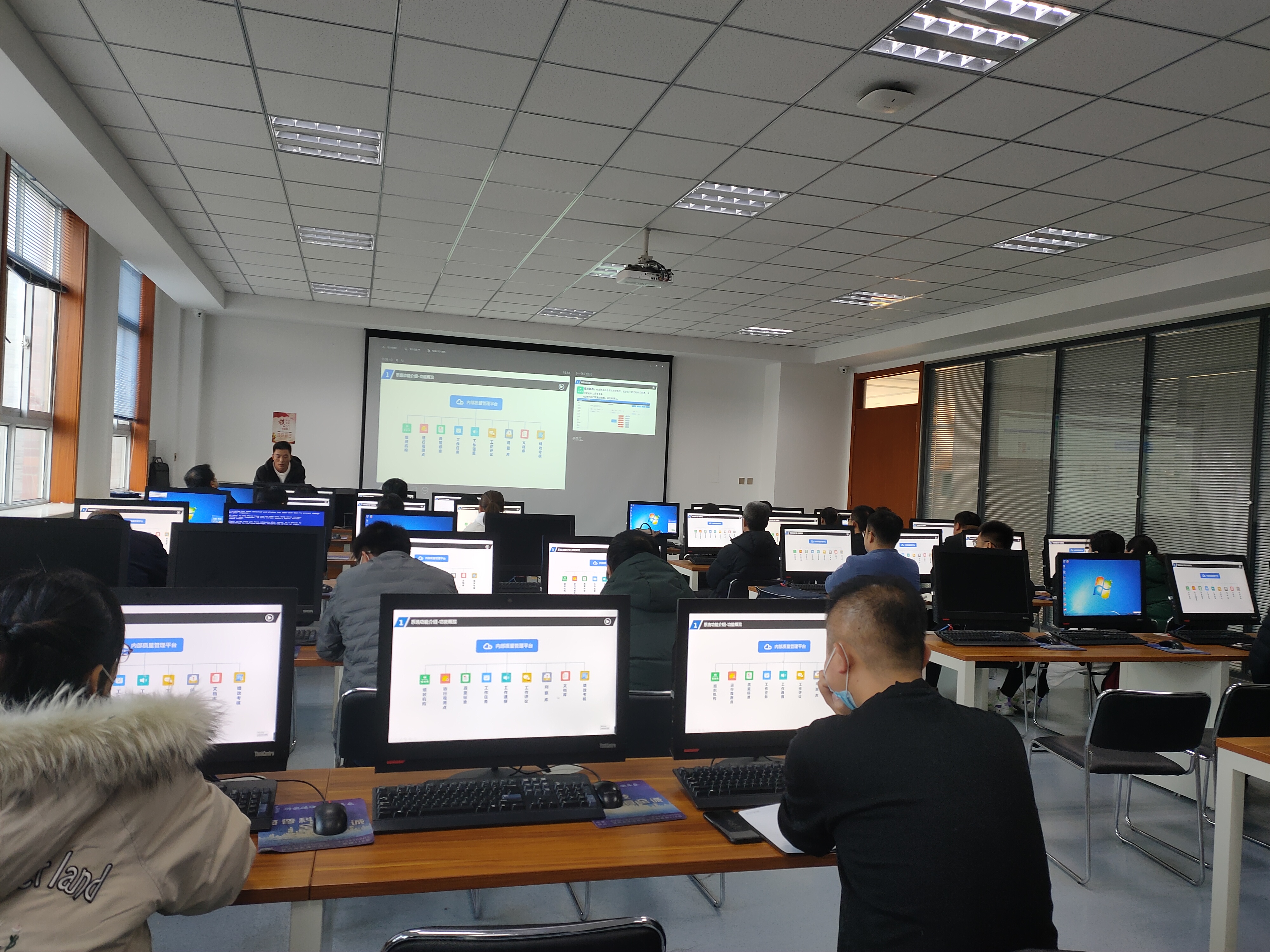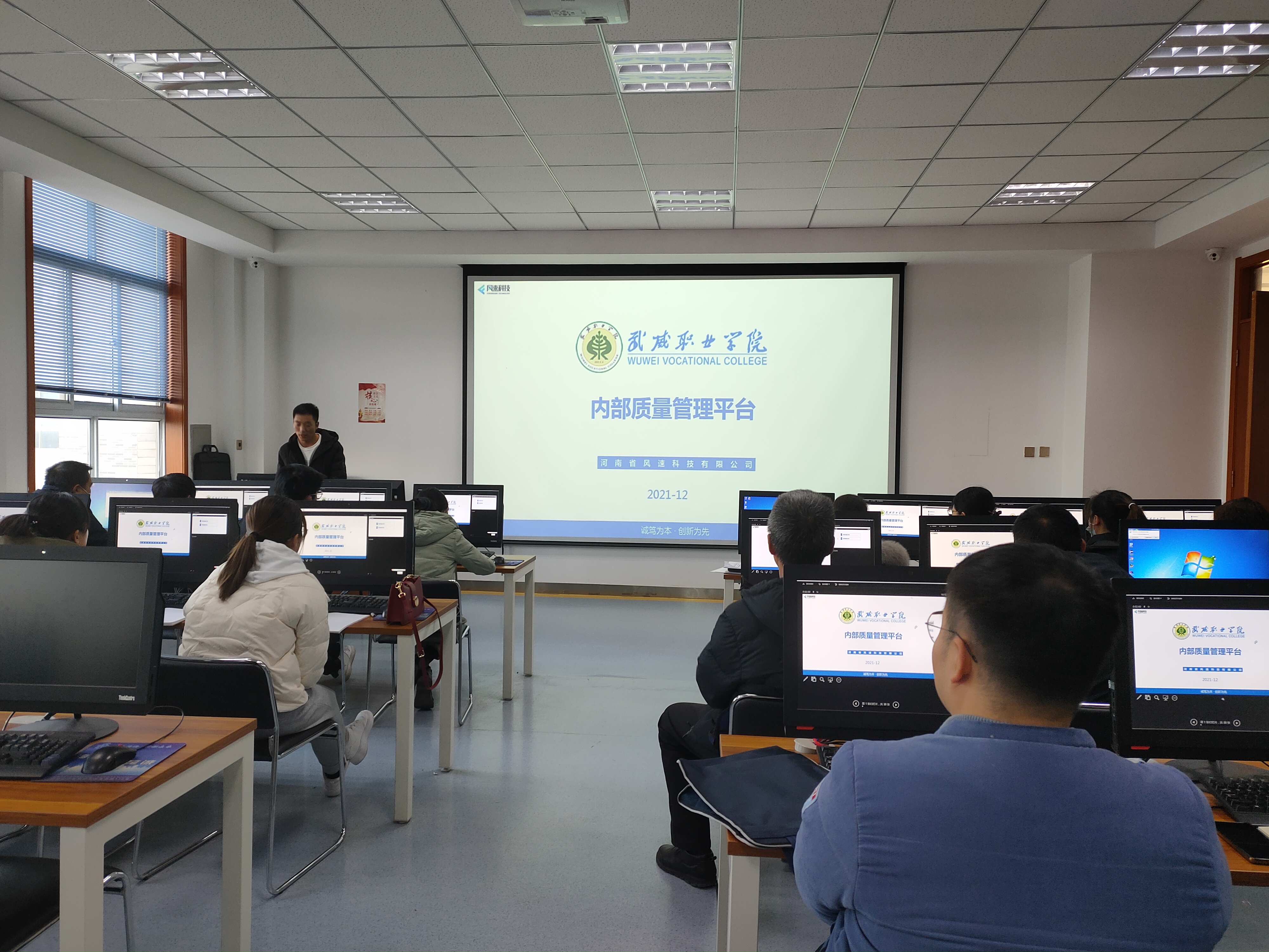 風(fēng)速科技有限公司項(xiàng)目經(jīng)理徐來(lái)彬?qū)?huì)教師進(jìn)行了培訓(xùn)。重點(diǎn)介紹了內(nèi)部質(zhì)量管理平臺(tái)整體架構(gòu)、主要功能、任務(wù)提取、上傳、轉(zhuǎn)辦,任務(wù)辦理與審核、通報(bào)、文檔庫(kù)上傳與使用、績(jī)效考核等,并進(jìn)行現(xiàn)場(chǎng)操作演示,就參會(huì)教師存在的問題進(jìn)行了溝通交流。