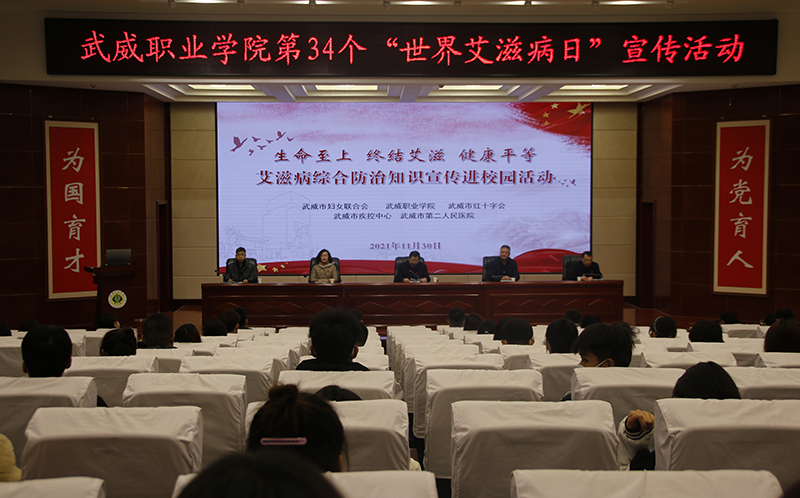 11月30日,學(xué)院在菁英廳開展了“生命至上 終結(jié)艾滋 健康平等”艾滋病綜合防治知識(shí)宣傳進(jìn)校園活動(dòng)。市疾控中心工會(huì)主席張富國、市婦聯(lián)副主席張惠華、學(xué)院黨委委員、副院長(zhǎng)王守云,市第二人民醫(yī)院院長(zhǎng)滕亮出席活動(dòng),活動(dòng)由學(xué)院護(hù)理系黨總支書記張建輝主持,市紅十字會(huì)、市疾控中心、天馬行市民云數(shù)據(jù)有限公司工作人員及武威職業(yè)學(xué)院師生代表參加活動(dòng)。