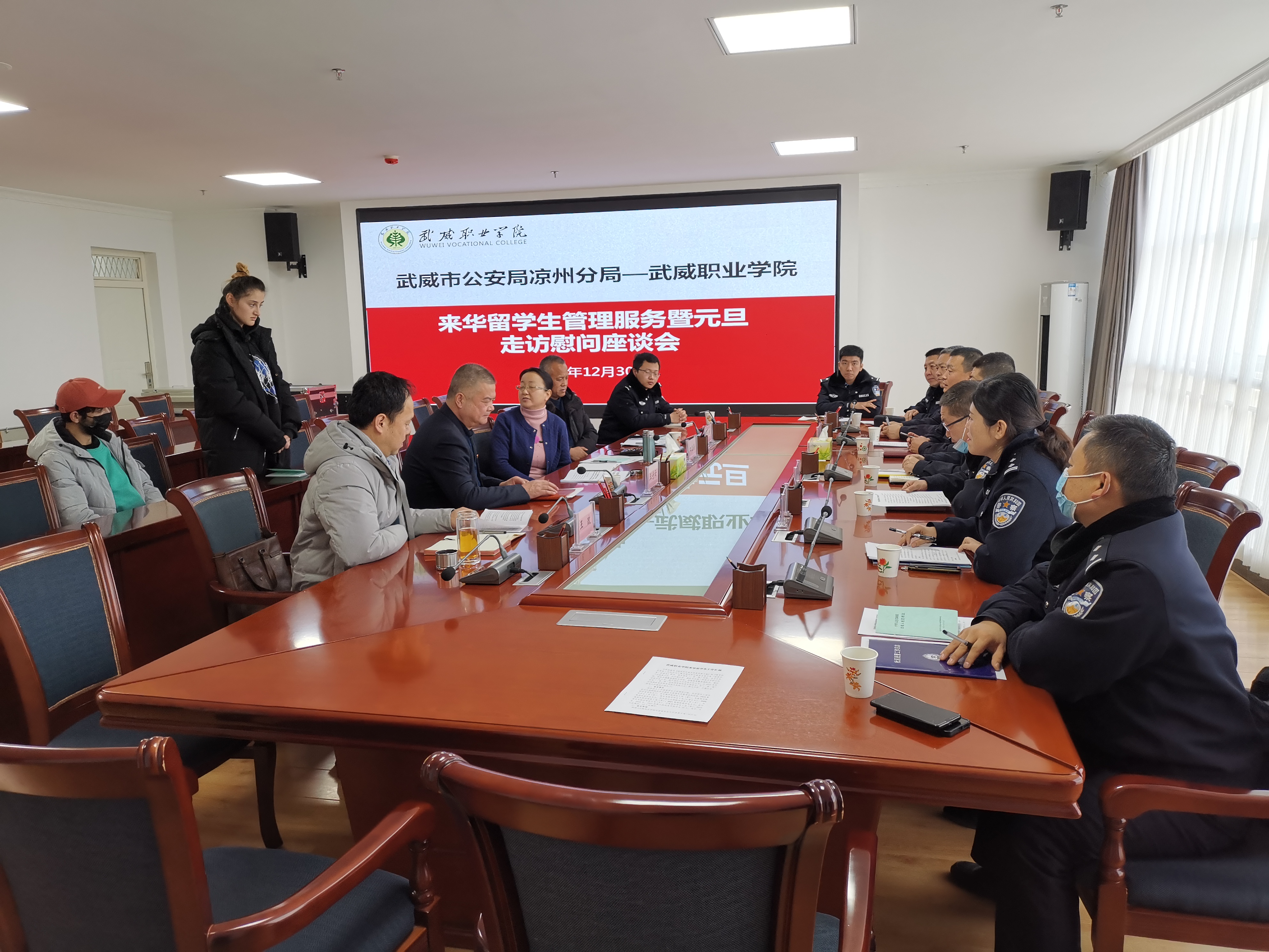 12月30日上午,市公安局出入境管理科、非政府組織管理辦公室,市公安局涼州分局國安大隊、反恐大隊、出入境管理辦公室、涼州分局西關(guān)街派出所一行十一人到訪學(xué)院,開展來華留學(xué)生管理服務(wù)暨元旦走訪慰問活動。黨委委員、副院長田迎春、王守云出席活動。國際合作與交流處處長潘從民、保衛(wèi)處處長王政及相關(guān)人員,2019級、2021級在華留學(xué)生參加活動。田迎春主持活動。