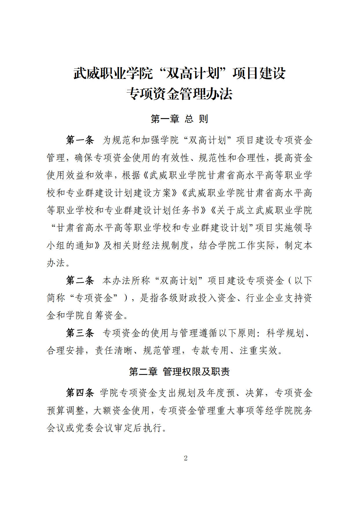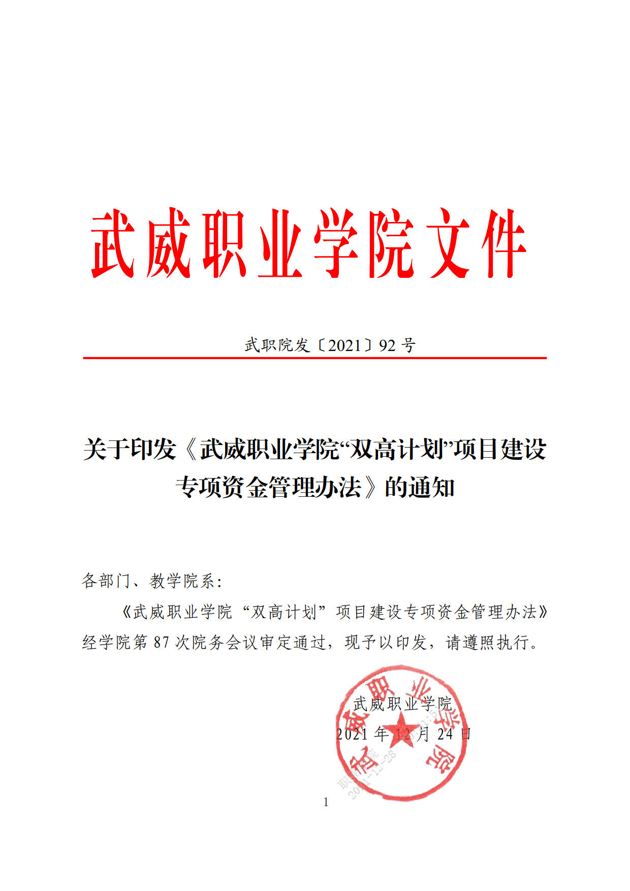 關(guān)于印發(fā)《武威職業(yè)學(xué)院“雙高計(jì)劃”項(xiàng)目建設(shè)專項(xiàng)資金管理辦法》的通知