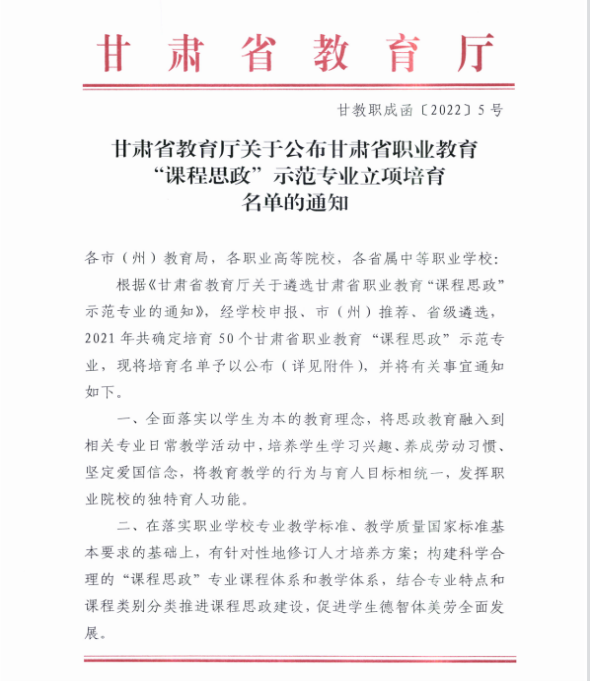 ? 近日,教育廳公布了2021年“技能甘肅”內(nèi)涵項目評審結(jié)果,中科低碳新能源技術(shù)學院申報的甘肅省職業(yè)教育“課程思政”示范專業(yè)、甘肅省職業(yè)教育在線精品課程、甘肅省職業(yè)教育名師工作室均獲評。