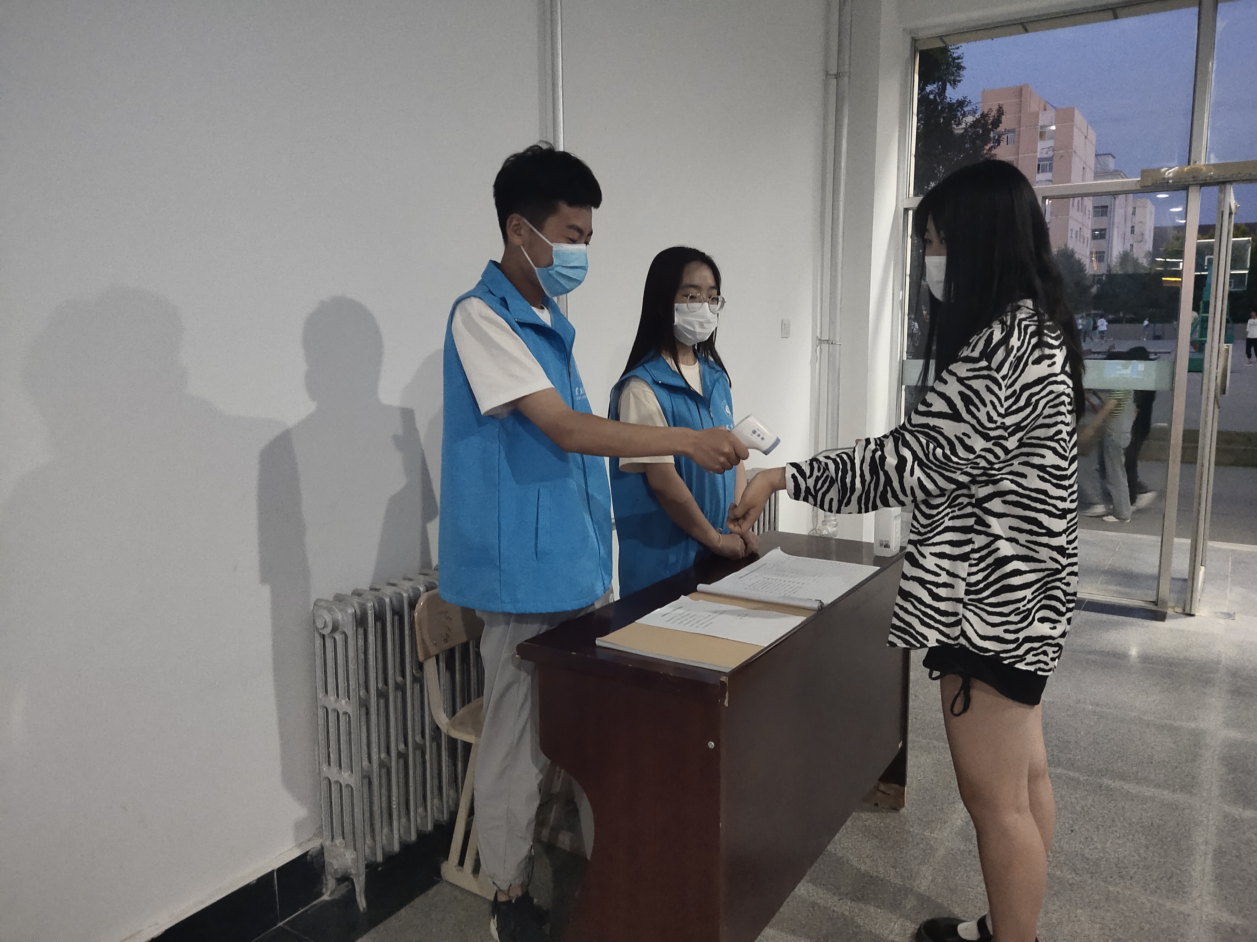 “您好,請(qǐng)出示一下您的健康碼、行程碼和核酸檢測(cè)證明,謝謝配合……”“您好,請(qǐng)?jiān)谶@邊做一下登記,謝謝配合?!蔽以嚎挂咧驹刚叻?wù)隊(duì),在食堂門口,水房門口,宿舍樓,教學(xué)樓門口,志愿者們身穿“紅馬甲”,以所在學(xué)院為單元按照疫情期間門禁管理要求開展“疫情防控值班”志愿服務(wù)活動(dòng),凡來訪者一律要求戴口罩,亮健康碼,行程碼,測(cè)量體溫正常后方可通行。