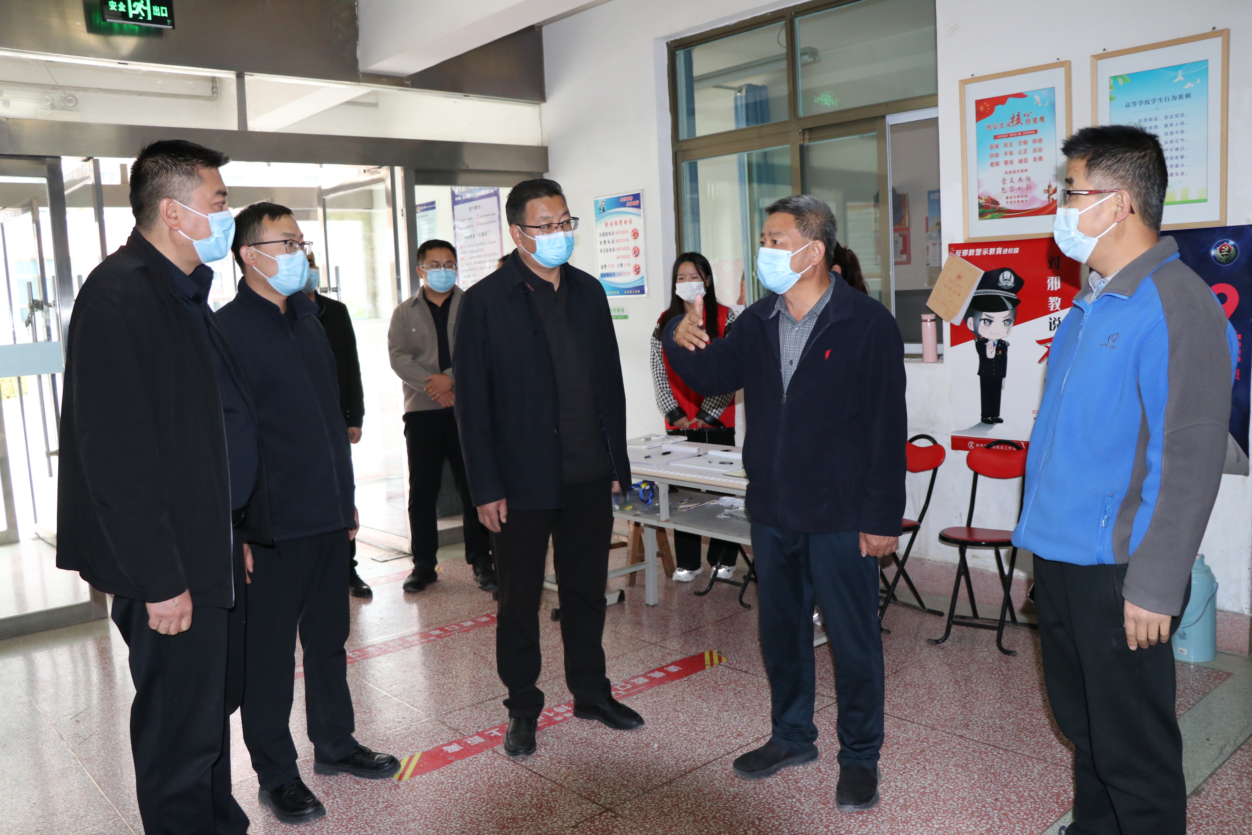 為進(jìn)一步加強(qiáng)校園疫情防控和安全穩(wěn)定工作,排查風(fēng)險(xiǎn)隱患,筑牢安全防線,10月14日,黨委書(shū)記、校長(zhǎng)趙明,黨委委員,紀(jì)委書(shū)記、監(jiān)察專(zhuān)員陳曉煜一行對(duì)校園內(nèi)重點(diǎn)場(chǎng)所進(jìn)行督導(dǎo)檢查。學(xué)生工作處、安全保衛(wèi)處等相關(guān)部門(mén)負(fù)責(zé)人一同檢查。