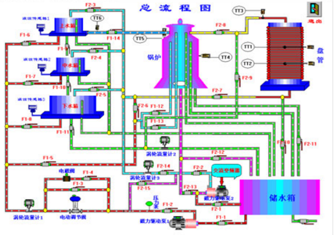 高級(jí)過(guò)程控制系統(tǒng)主要特點(diǎn)是被調(diào)參數(shù)囊括了流量、壓力、液位、溫度四大熱工參數(shù);執(zhí)行器中既有電動(dòng)調(diào)節(jié)閥儀表類執(zhí)行機(jī)構(gòu),又有變頻器等電力拖動(dòng)類執(zhí)行器。系統(tǒng)除了能改變調(diào)節(jié)器的設(shè)定值作階躍擾動(dòng)外,還可在對(duì)象中通過(guò)電磁閥和手操作閥制造各種擾動(dòng)。一個(gè)被調(diào)參數(shù)可用不同的動(dòng)力源、不同的執(zhí)行器和不同的工藝線路下可演變成多種調(diào)節(jié)回路,以利于討論、比較各種調(diào)節(jié)方案的優(yōu)劣,從而進(jìn)行多變量控制系統(tǒng)及特定的高級(jí)過(guò)程控制系統(tǒng)實(shí)驗(yàn)。