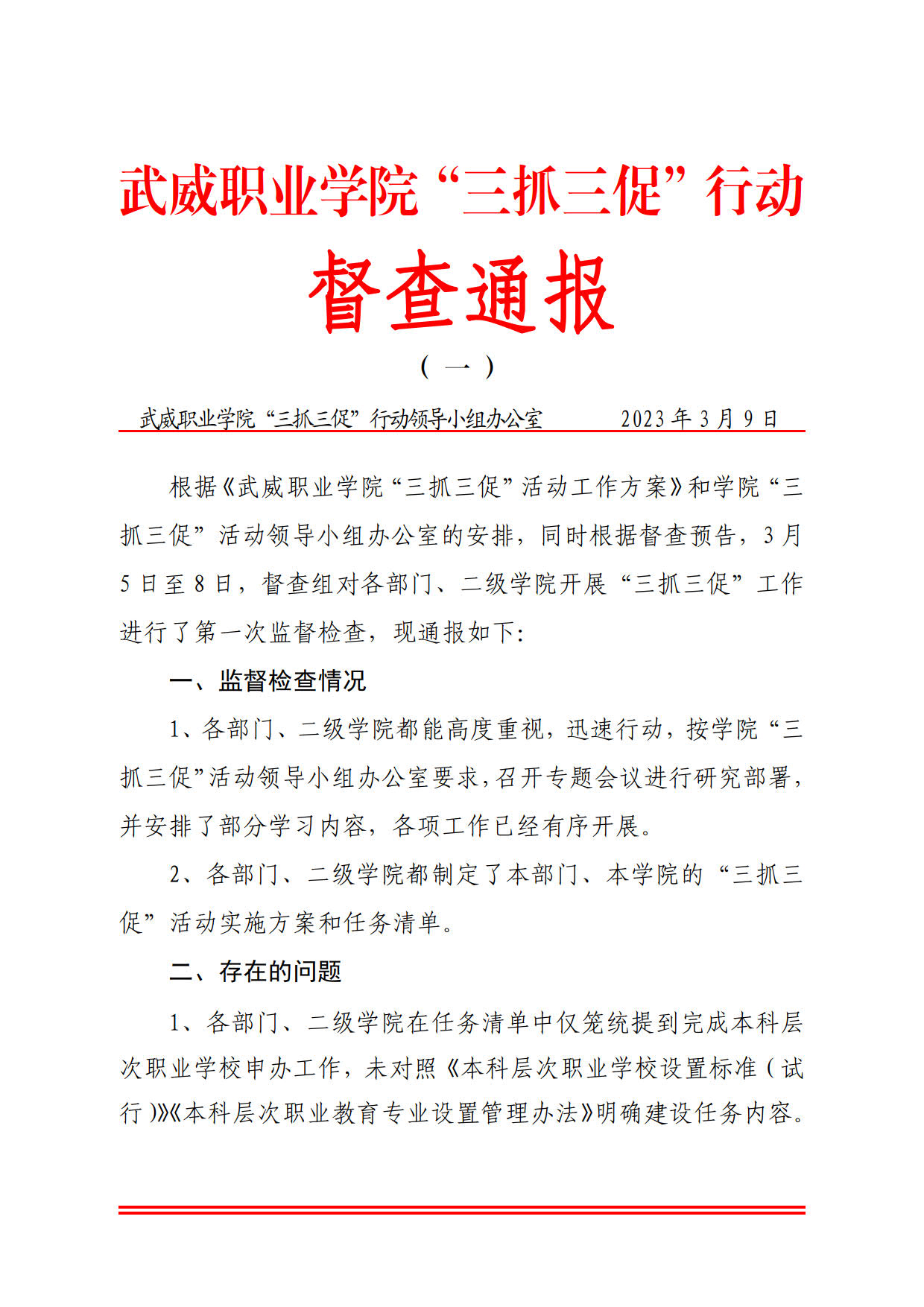 武威職業(yè)學(xué)院“三抓三促”行動督查通報(一)