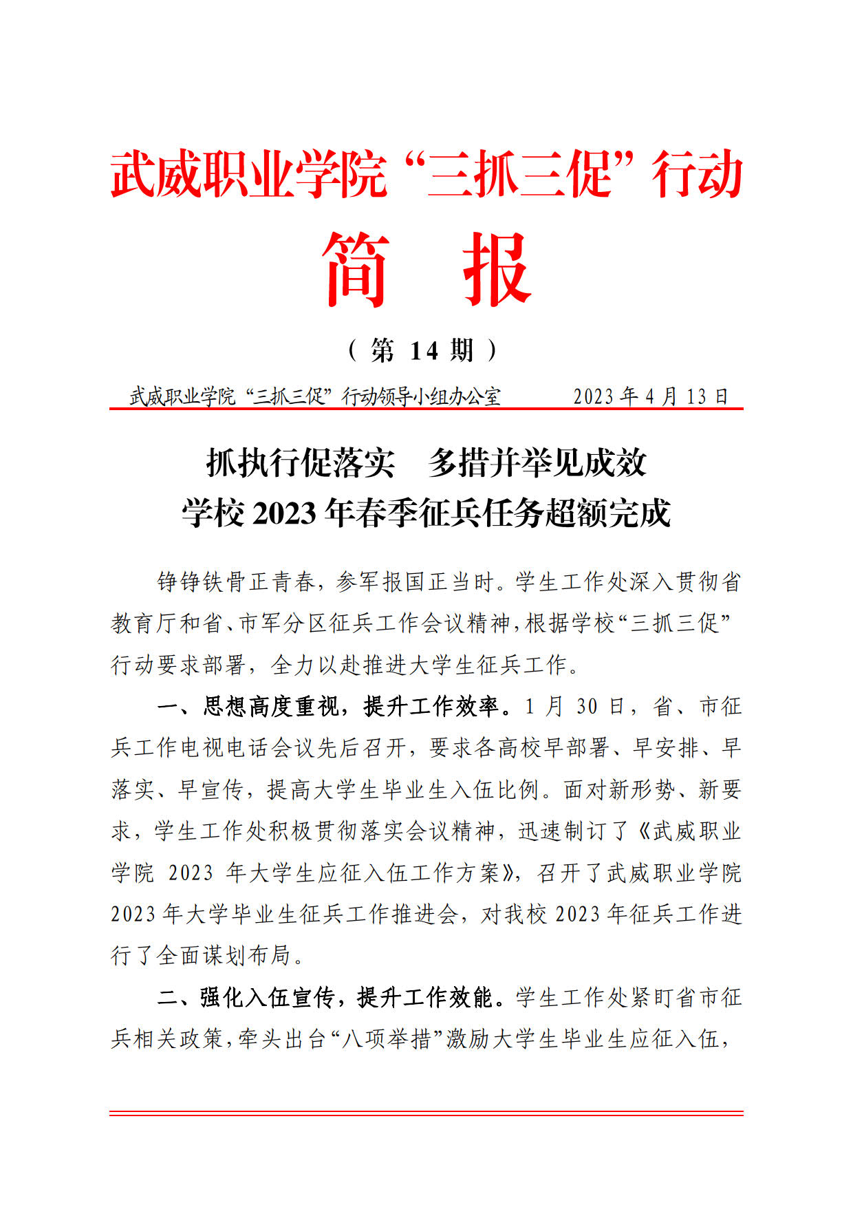 簡(jiǎn)報(bào)第14期:抓執(zhí)行促落實(shí) 多措并舉見(jiàn)成效 學(xué)校2023年春季征兵任務(wù)超額完成