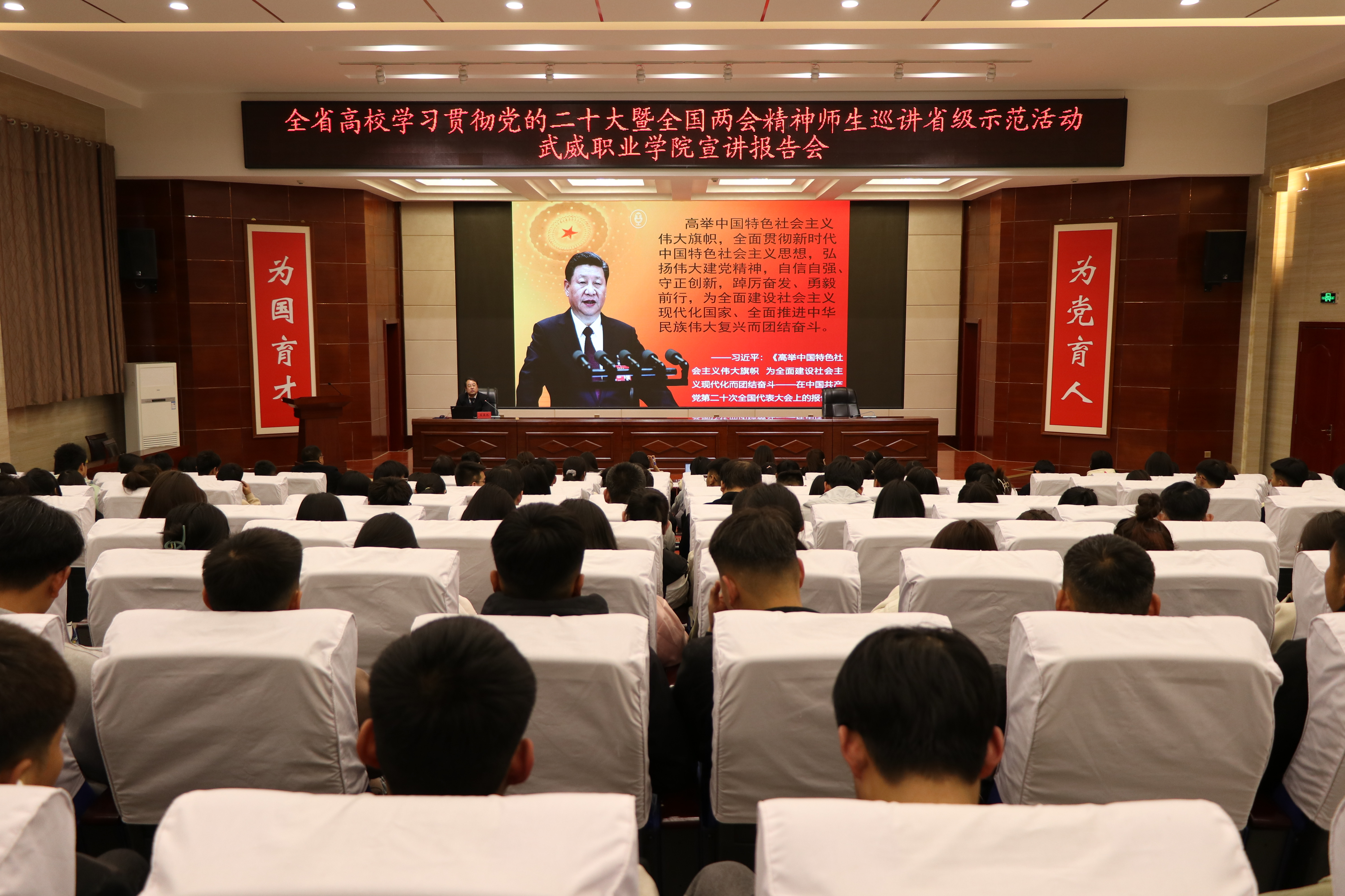 4月23日下午,省委教育工委“逐夢新征程 奮斗創(chuàng)未來”全省高校學(xué)習(xí)貫徹黨的二十大暨全國兩會(huì)精神師生巡講省級(jí)示范活動(dòng),第五巡講團(tuán)來我校開展宣講。第五巡講團(tuán)組長、蘭州交通大學(xué)馬克思主義學(xué)院蘇星鴻教授,作了專題報(bào)告。學(xué)校宣傳統(tǒng)戰(zhàn)部全體成員、馬克思主義學(xué)院全體教師、各二級(jí)學(xué)院學(xué)生代表共計(jì)200余人聆聽了巡講報(bào)告。