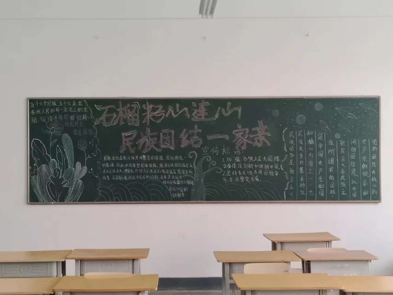 ? ? ? ?為深入開展民族團(tuán)結(jié)進(jìn)步創(chuàng)建活動,加強(qiáng)對學(xué)生的愛國主義教育和民族團(tuán)結(jié)教育,武威職業(yè)學(xué)院藥學(xué)院緊緊圍繞“中華民族一家親” 這一主題,組織各班級開展了民族團(tuán)結(jié)進(jìn)步創(chuàng)建主題黑板報(bào)和各類形式的宣傳活動,激勵學(xué)生自覺維護(hù)全國各族人民大團(tuán)結(jié),從而進(jìn)一步加強(qiáng)中華民族共同體意識。
