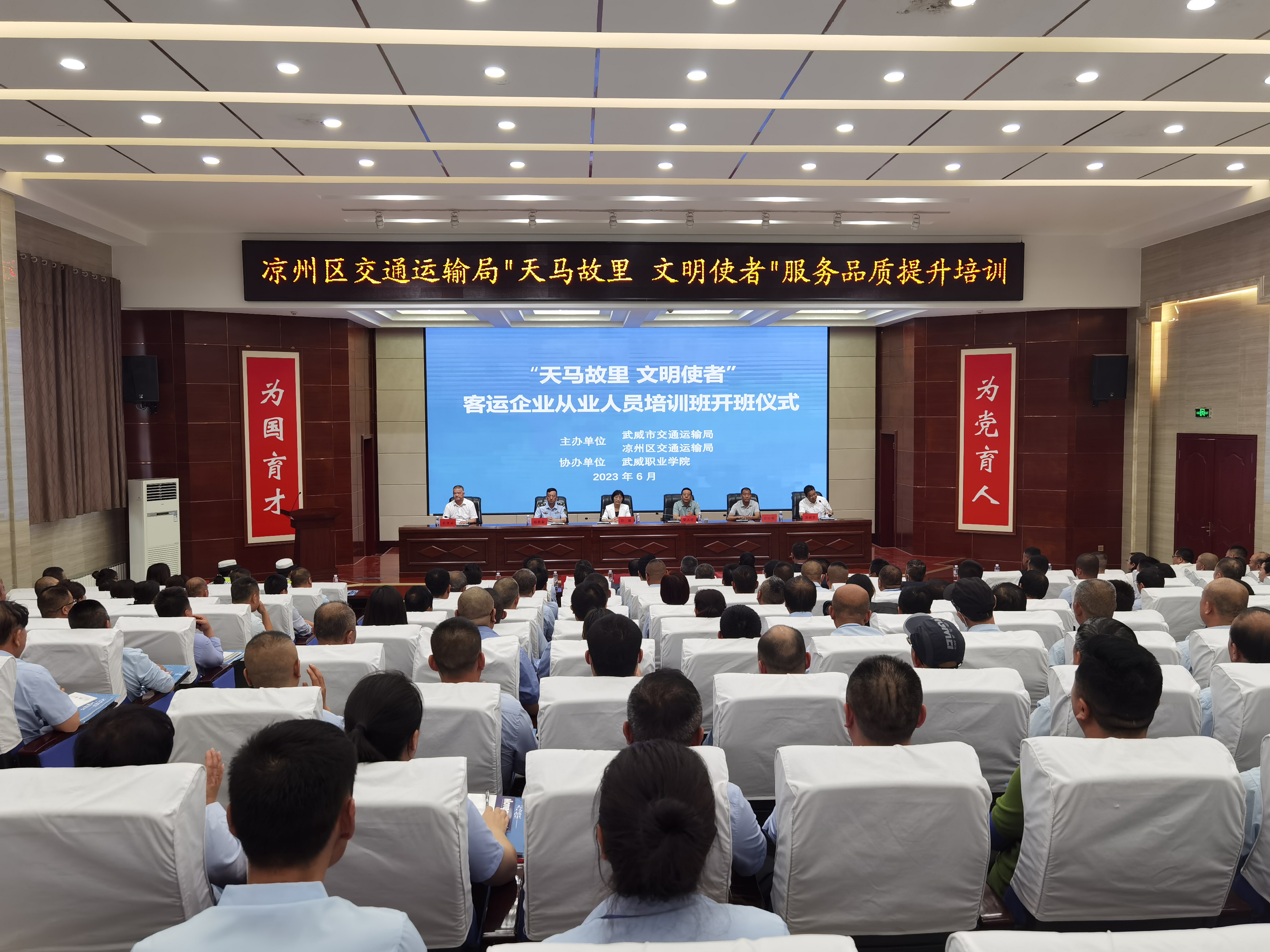 6月28日,“天馬故里 文明使者”客運(yùn)企業(yè)從業(yè)人員服務(wù)品質(zhì)提升培訓(xùn)班在武威職業(yè)學(xué)院開班。市交通局副局長柴天祥,區(qū)委常委、統(tǒng)戰(zhàn)部部長、區(qū)政協(xié)黨組書記許娜,市交通運(yùn)輸綜合行政執(zhí)法隊(duì)隊(duì)長韓世泰,市運(yùn)管局副局長許培明,學(xué)校黨委委員、副校長王守云出席開班儀式。開班式由涼州區(qū)交通運(yùn)輸局副局長蘇銀堂主持,出租客運(yùn)公司、城市公交公司和定制客運(yùn)公司管理人員及從業(yè)人員220人參加開班儀式。
