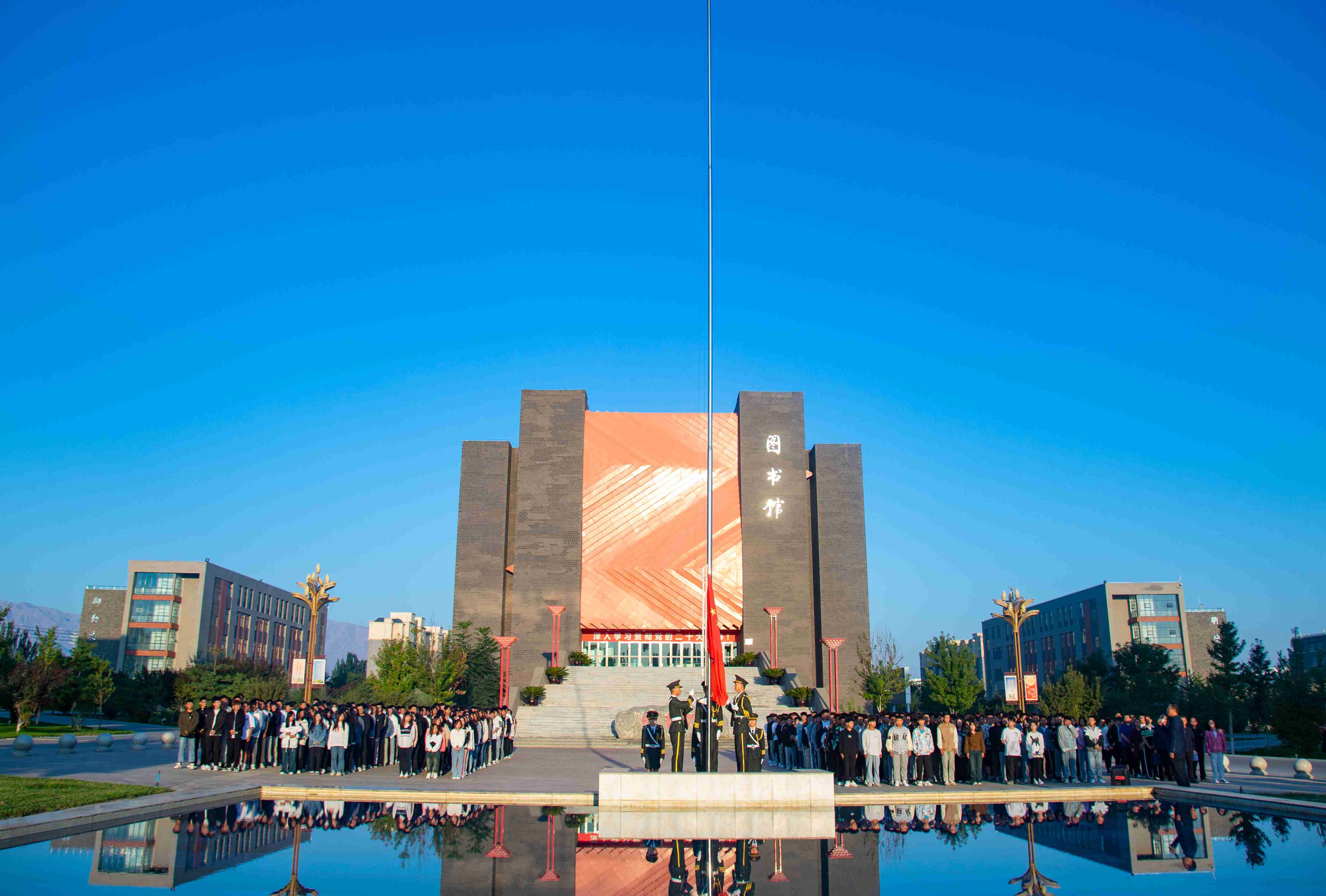 8月28日早上7點,信息技術學院在圖書館廣場舉行升國旗儀式,黨總支書記潘從明、院長李亞梅和全體師生參加了此次升旗儀式。