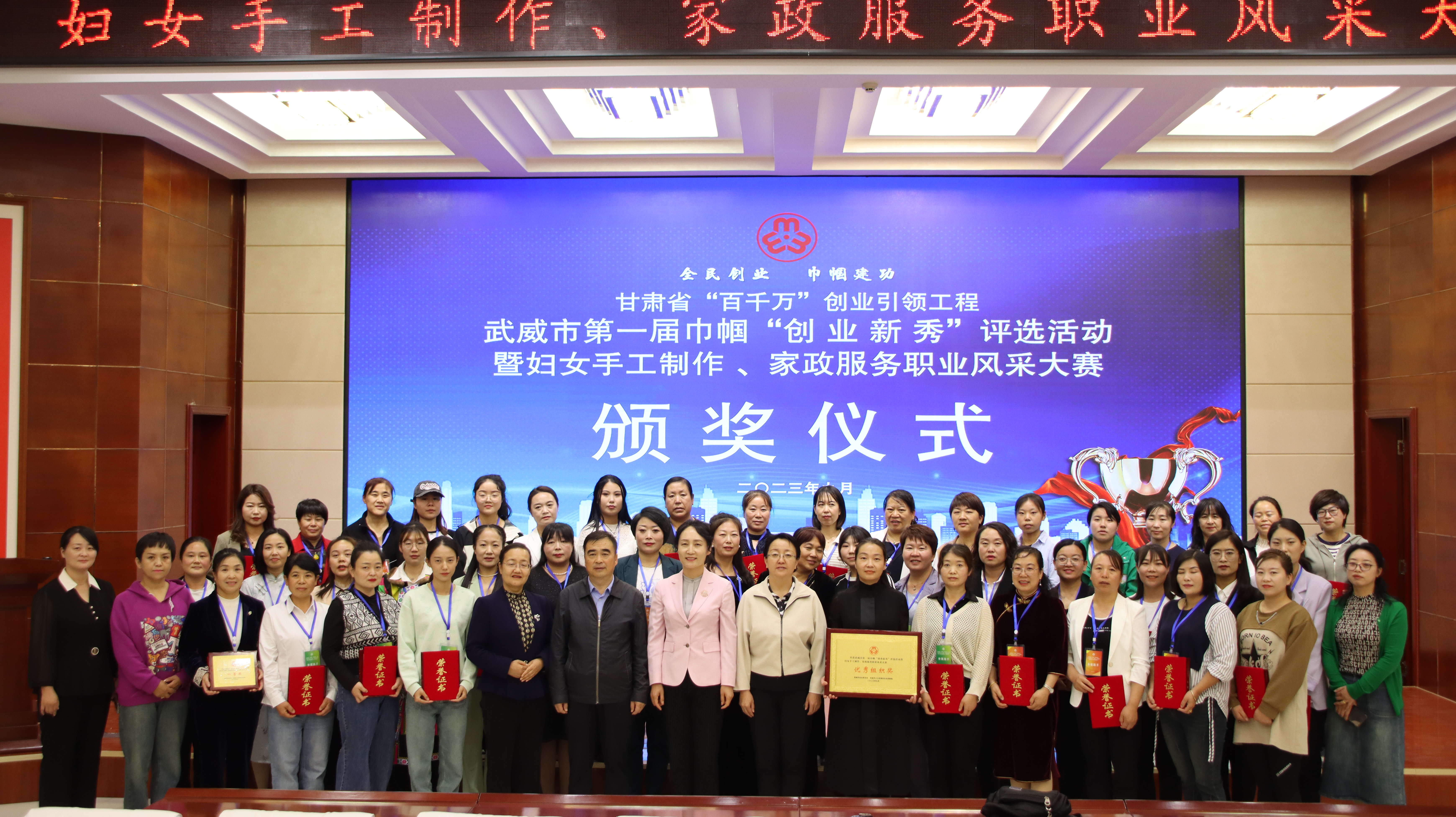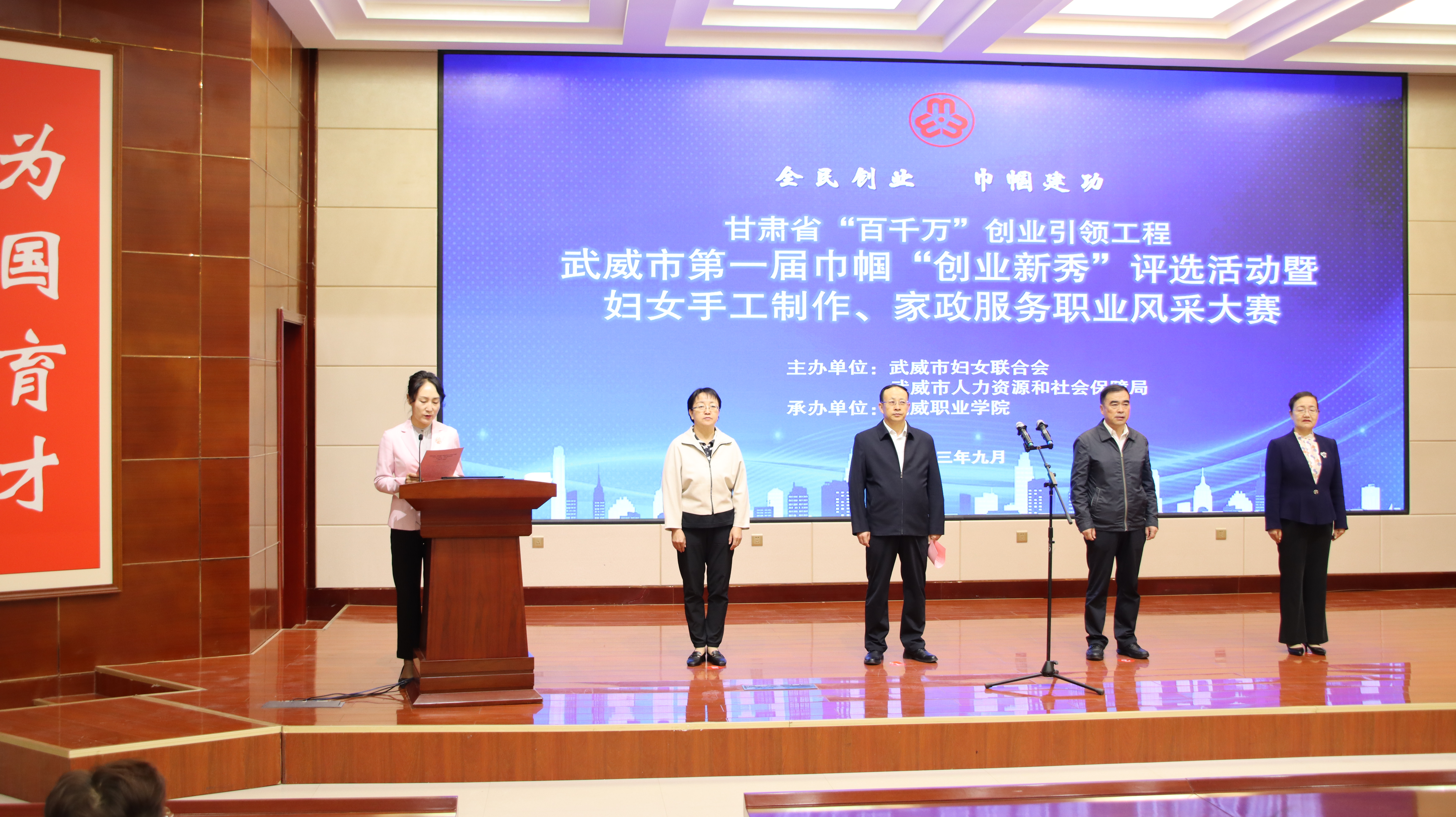 9 月 27 日,由市婦聯(lián)、市人社局主辦、我校承辦的甘肅省“百千萬”創(chuàng)業(yè)引領(lǐng)工程武威市第一屆巾幗“創(chuàng)業(yè)新秀”評選活動暨婦女手工制作、家政服務(wù)職業(yè)風(fēng)采大賽成功舉辦,武威市人社局黨組書記,局長陳昱川,市婦聯(lián)黨組書記,主席劉玉華,武威市就業(yè)局局長魏斌,武威市婦聯(lián)副主席張惠華,縣區(qū)婦聯(lián)負責(zé)同志,學(xué)校黨委委員,副校長田迎春出席本次活動,參賽選手等100 人參加大賽。