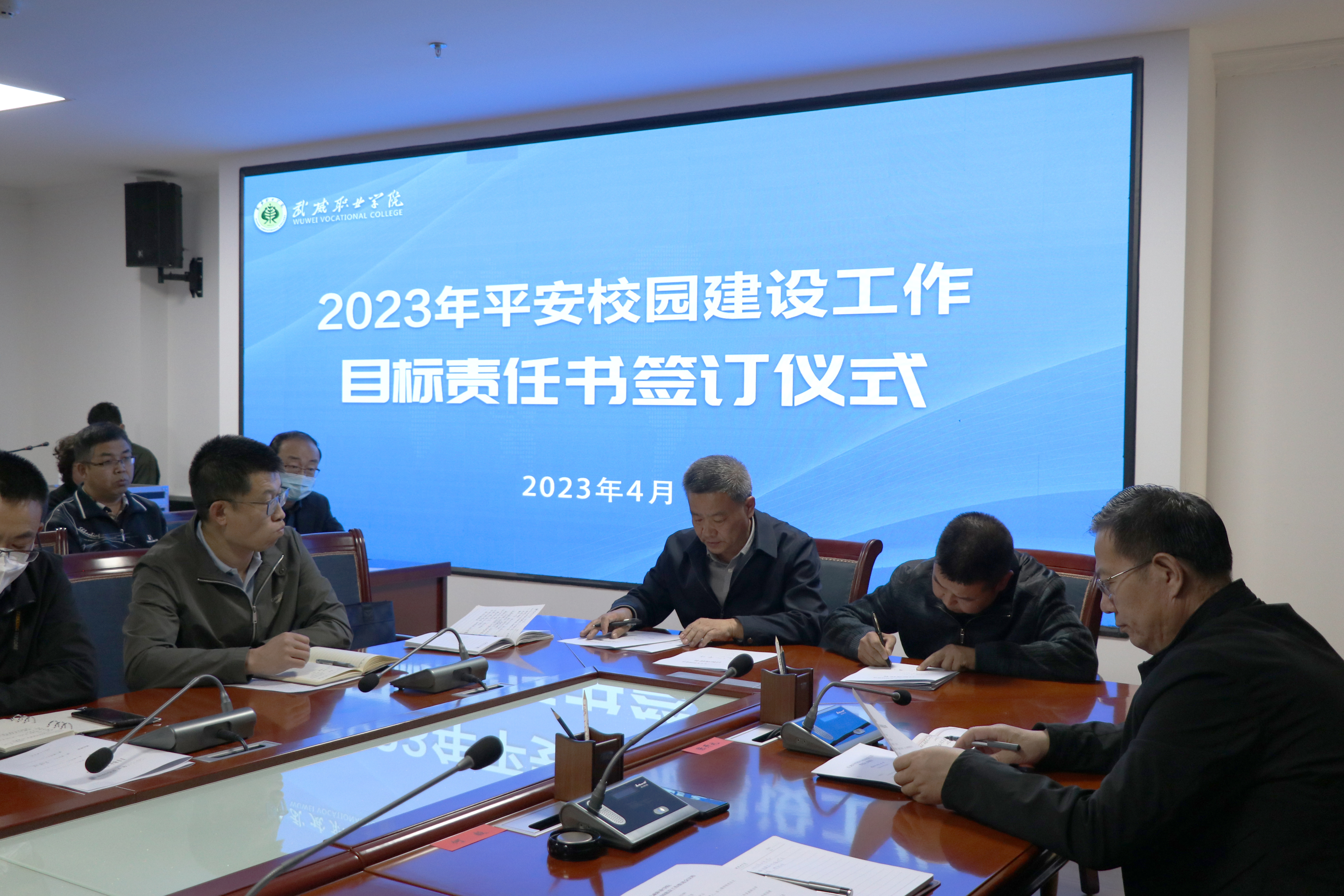 趙明與各部門(mén)、二級(jí)學(xué)院簽訂了2023年平安校園建設(shè)工作目標(biāo)責(zé)任書(shū)。王守云結(jié)合學(xué)校實(shí)際,對(duì)2023年平安校園建設(shè)工作作了安排。