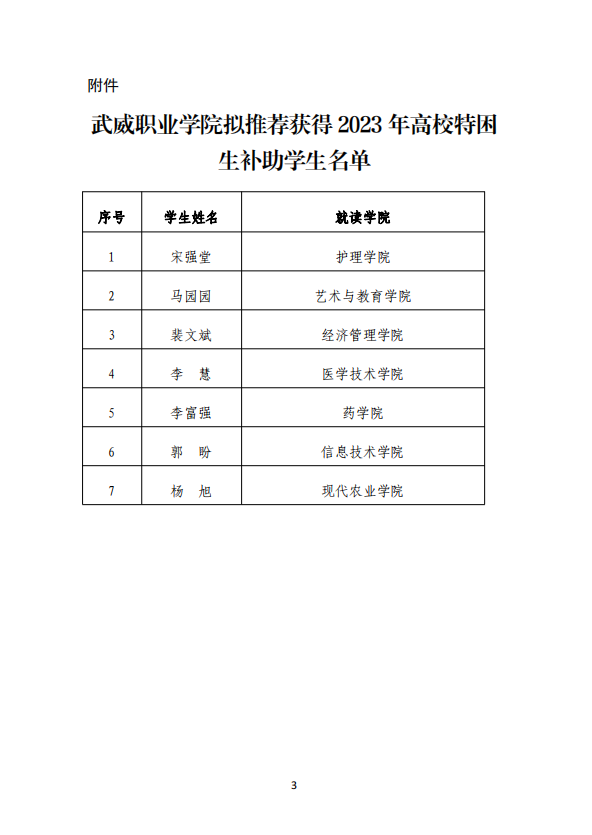 武威職業(yè)學(xué)院關(guān)于2023年高校特困生補助獲得者的公示