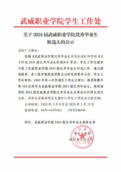 關(guān)于2024屆武威職業(yè)學(xué)院優(yōu)秀畢業(yè)生候選人的公示