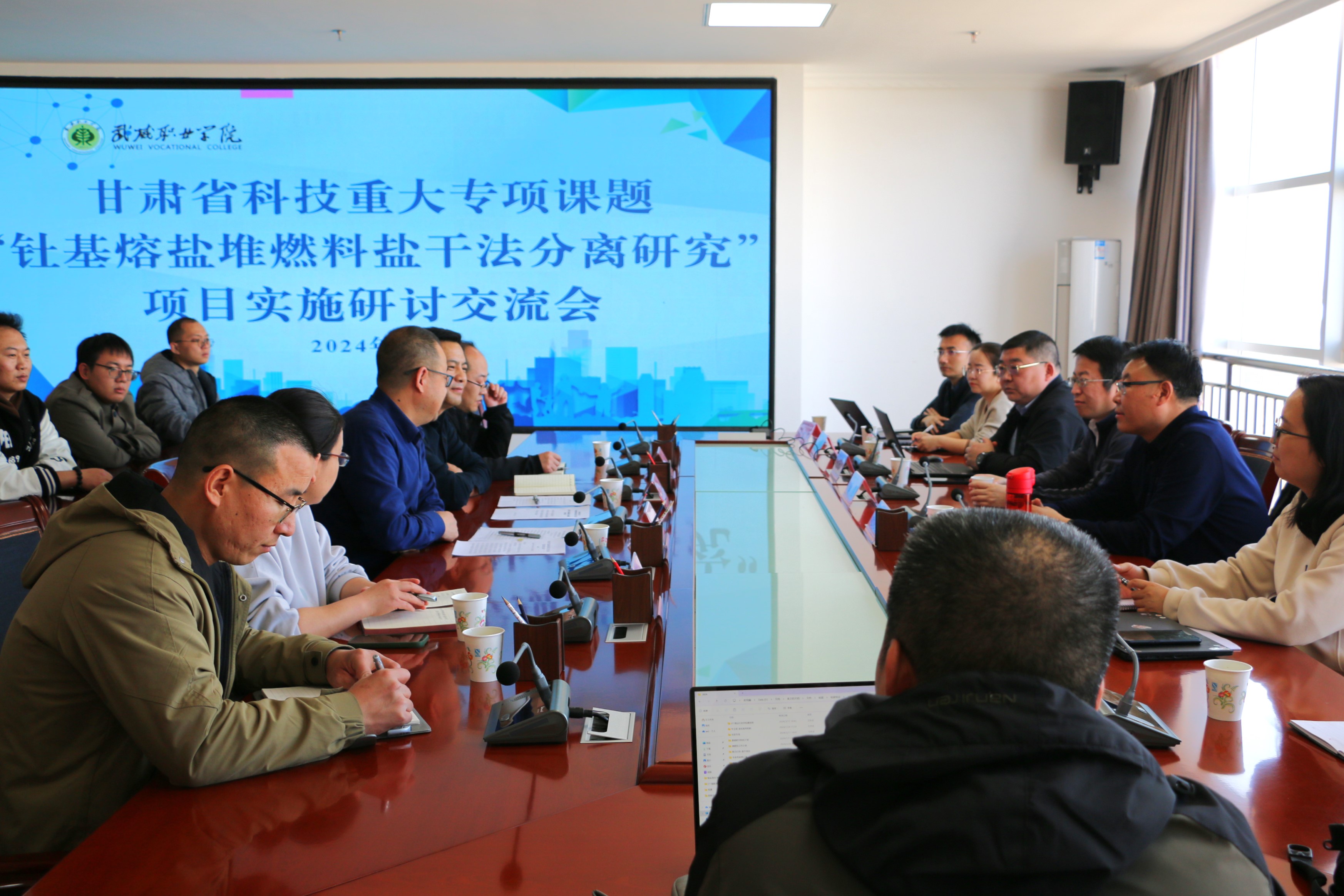 2024年3月11日,甘肅省科技重大專項(xiàng)課題“釷基熔鹽堆燃料鹽干法分離研究”項(xiàng)目實(shí)施研討交流會(huì)在武威職業(yè)學(xué)院能源科技樓811舉行。中科武威新能源研究所主任趙先堂,中國(guó)科學(xué)院上海應(yīng)用物理研究所主任龔昱一行15人,武威職業(yè)學(xué)院黨委副書記翟存祥出席此次會(huì)議。項(xiàng)目骨干、武威職業(yè)學(xué)院教師代表約50人參加此次會(huì)議。會(huì)議由中科低碳新能源技術(shù)學(xué)院副院長(zhǎng)黃述杰主持。