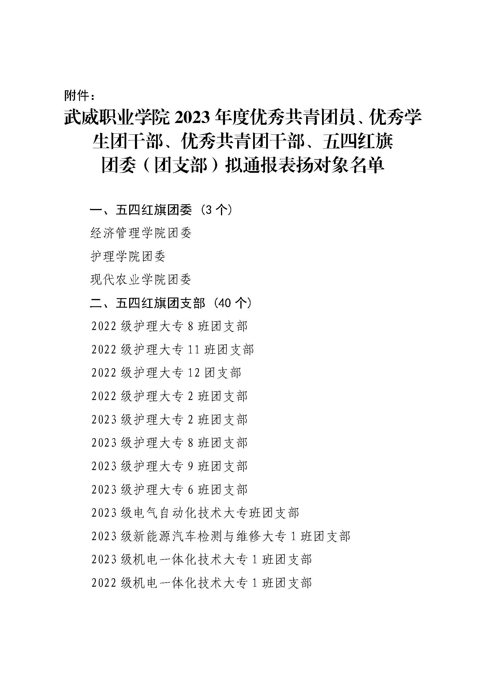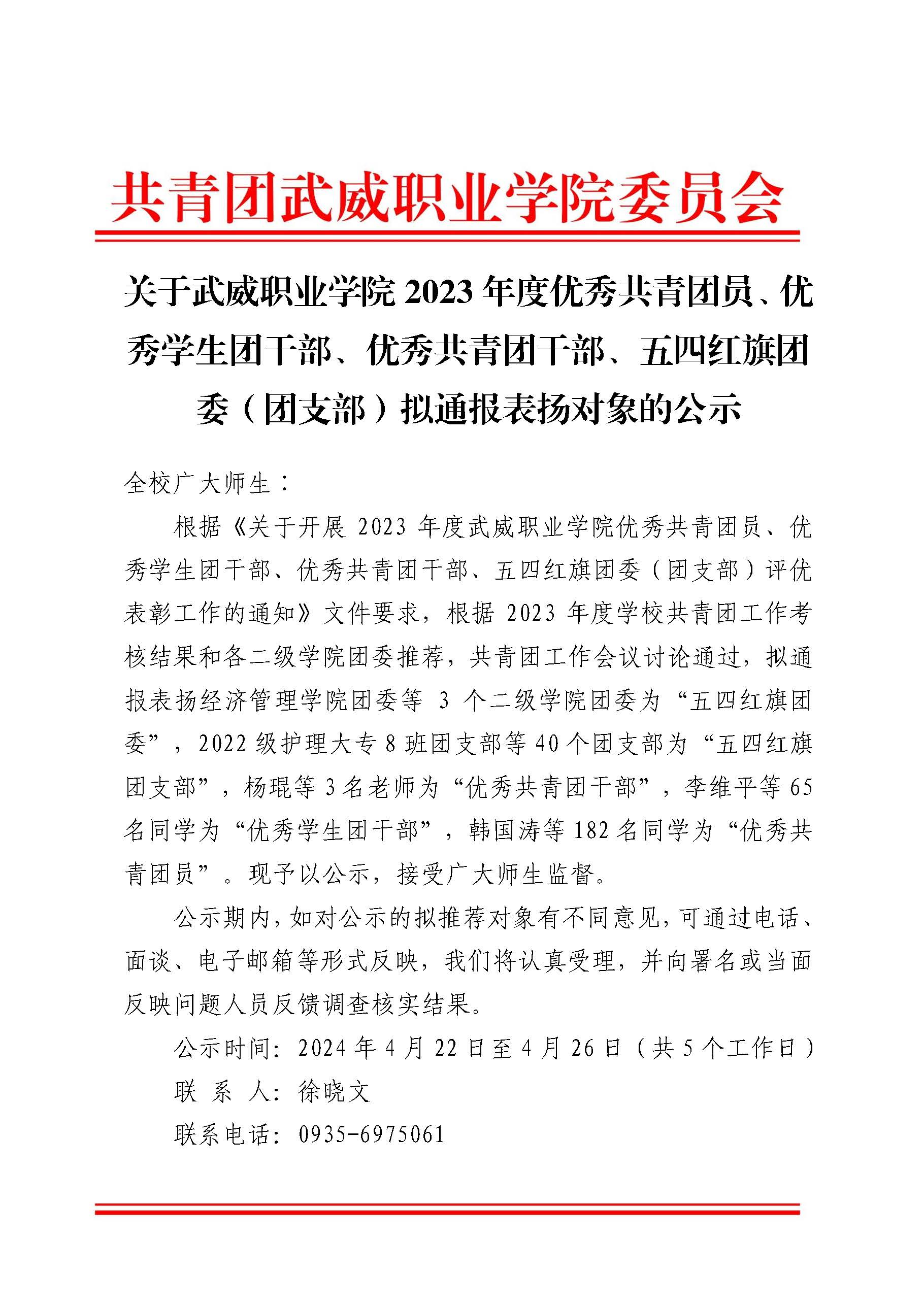 關(guān)于武威職業(yè)學(xué)院2023年度優(yōu)秀共青團(tuán)員、優(yōu)秀學(xué)生團(tuán)干部、優(yōu)秀共青團(tuán)干部、五四紅旗團(tuán)委(團(tuán)支部)擬通報表揚(yáng)對象的公示